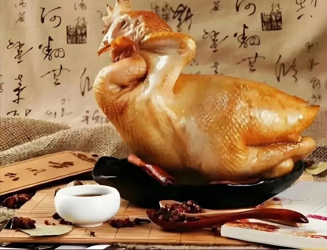 选料严格到只挑450天以上的蛋鸡,经宰杀处理,整理成“恭卧状”,刷上天然蜂蜜挂浆,油炸上色后,放到陈年老汤中,放入香叶、桂皮等十八味香辛料,小火焖煮14小时而成。