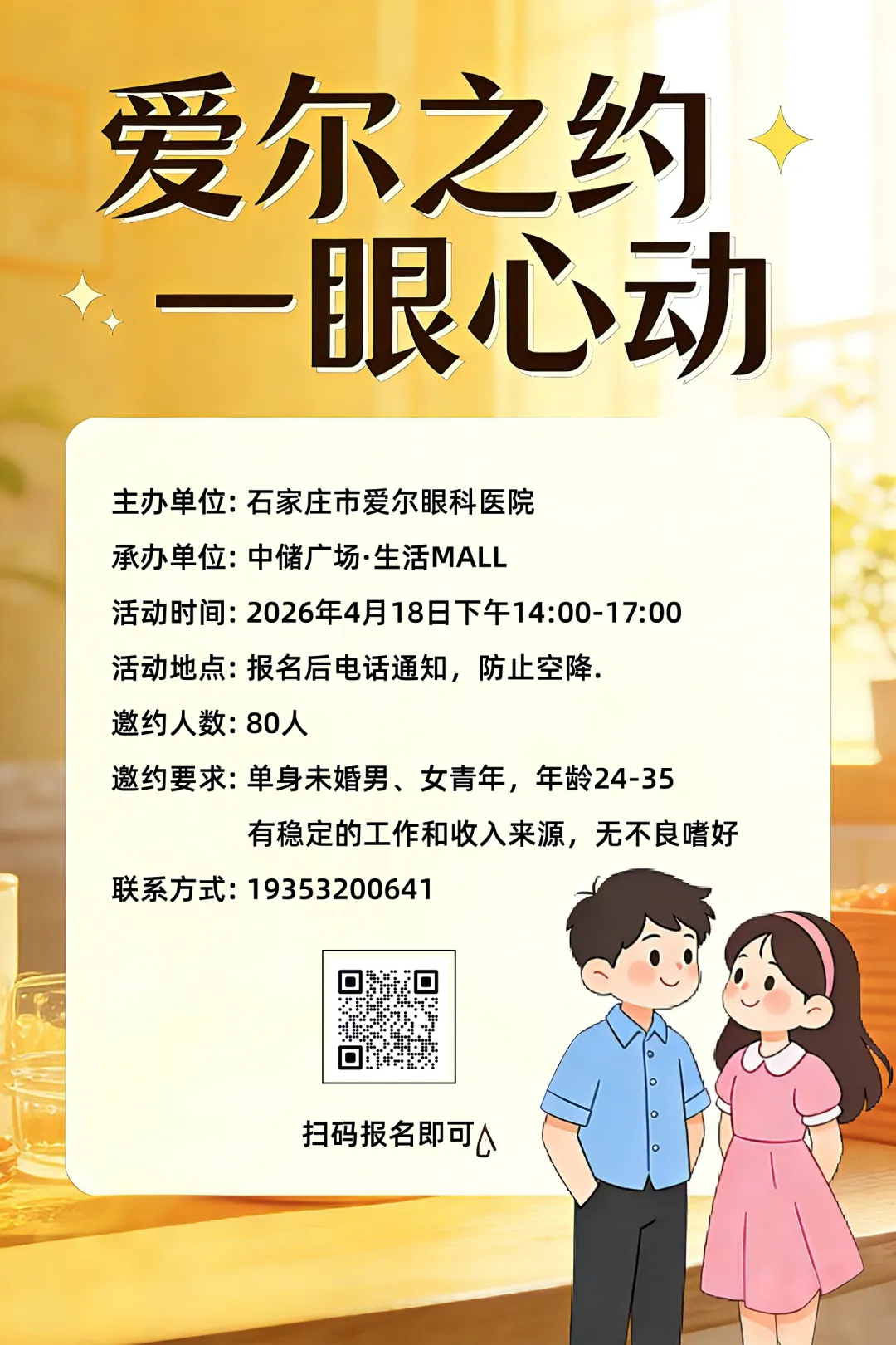 春日寻缘,爱尔为媒!石家庄市爱尔眼科医院主办的爱尔之约·一眼心动单身交友活动来袭,80个优质名额,助你邂逅良缘~