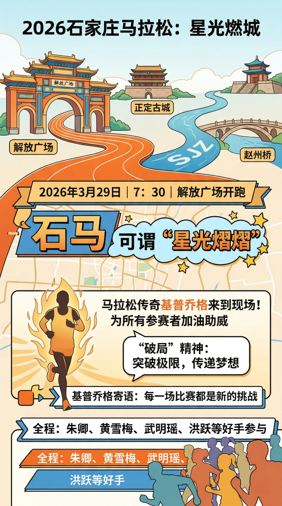 我是小马,现在来看看2026年的石家庄马拉松的成绩,于3月29日7:30在解放广场开跑,马拉松传奇人物基普乔格,空降到