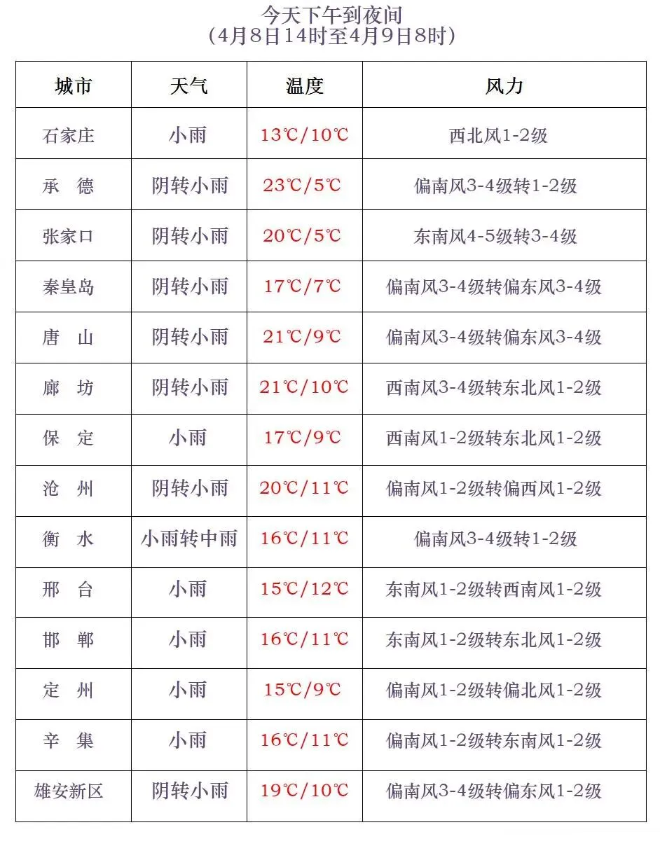今天下午到夜间,全省多云转阴,石家庄、沧州及以南地区有小到中雨,其他地区有小雨或零星小雨。