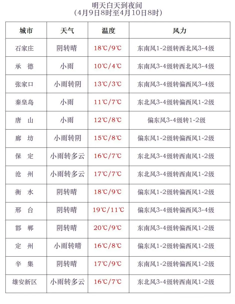 明天白天,石家庄南部、衡水南部、邢台、邯郸阴转多云,坝上地区阴有雨夹雪,其他地区阴有小雨或阵雨,其中张家口东部、承德中南部局地有中雨。