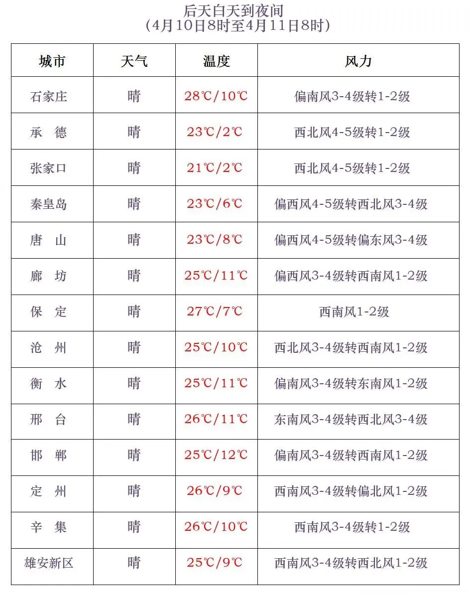 10日白天,张家口、承德、保定西北部有西北风4到5级,阵风6到7级,局地可达8级。