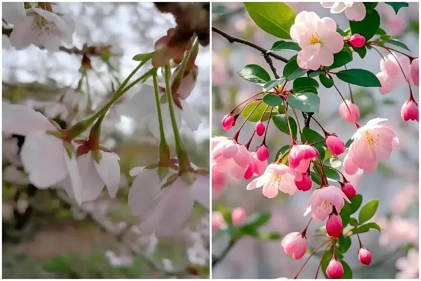 ❗️ 与樱花的核心区别:海棠花梗多为紫红色 / 红褐色、花瓣无缺口;樱花花梗细长,青绿色 / 浅绿色、花瓣顶端有小缺口,再也不混淆!