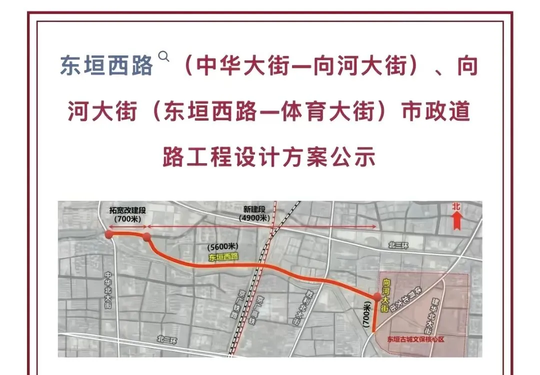东垣西路目前处于设计公示及前期筹备阶段,并没有正式开工。2026年1月,相关部门刚刚公布过这段路以及连接道路的设计方案,全长约5.6公里,红线宽度为60米,是双向6车道的主干道。