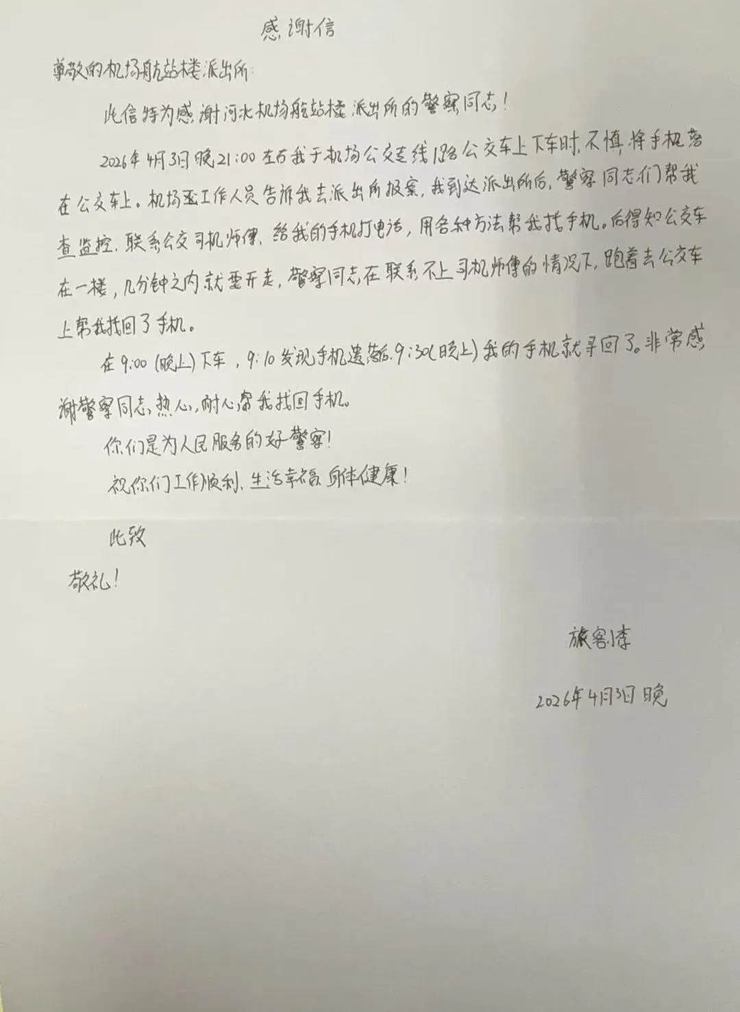 对民警高效寻回手机、暖心相助的感激之情