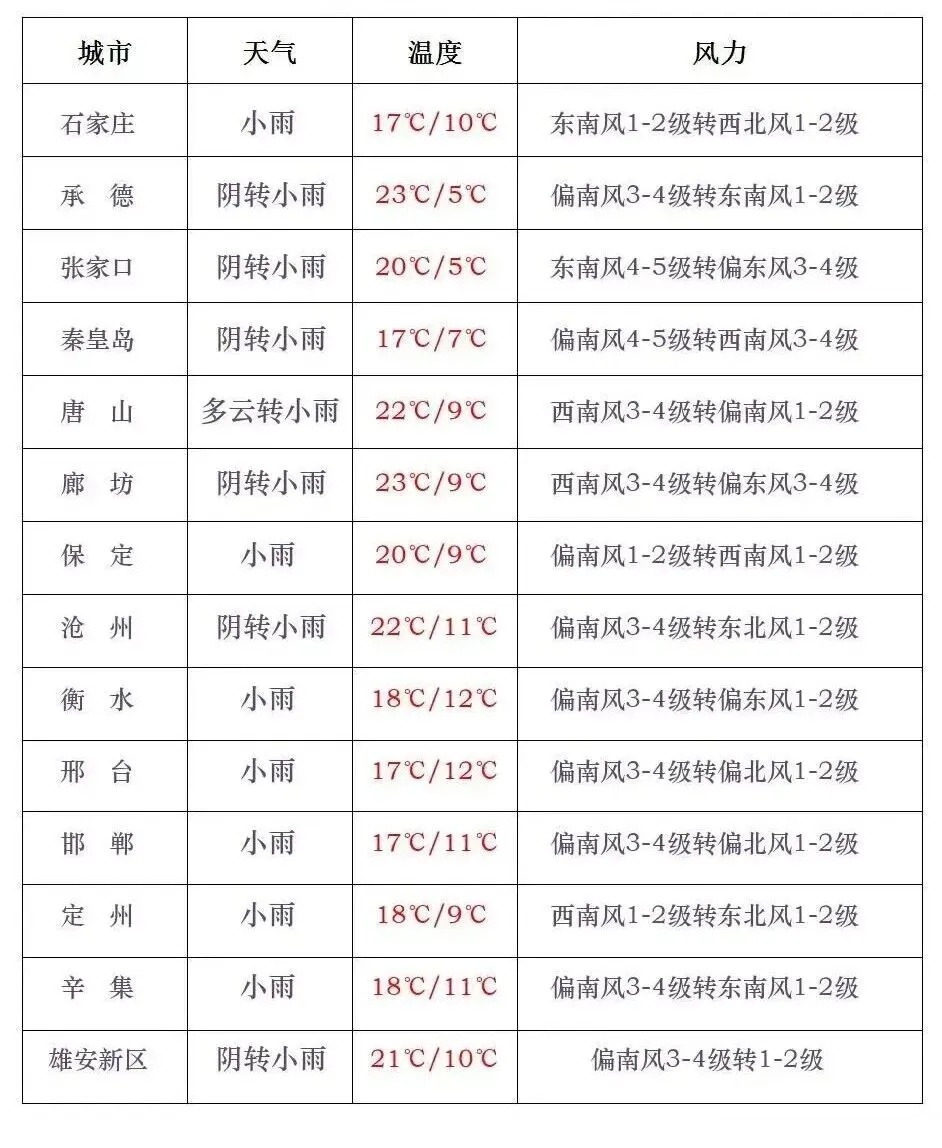 今天白天,全省多云转阴,张家口、承德西部、保定、石家庄、沧州西部、衡水、邢台、邯郸有小雨或零星小雨。今天夜间到9日,全省阴有小雨,其中张家口东部、承德局地有中雨,承德的坝上地区有雨夹雪。4月8日主要城市预报