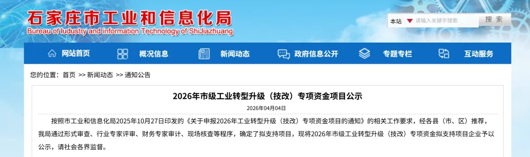 按照市工业和信息化局2025年10月27日印发的《关于申报2026年工业转型升级(技改)专项资金项目的通知》的相关工作要求,经各县(市、区)推荐,我局通过形式审查、行业专家评审、财务专家审计、现场核查等程序,确定了拟支持项目,现将2026年市级工业转型升级(技改)专项资金拟支持项目企业予以公示,请社会各界监督。