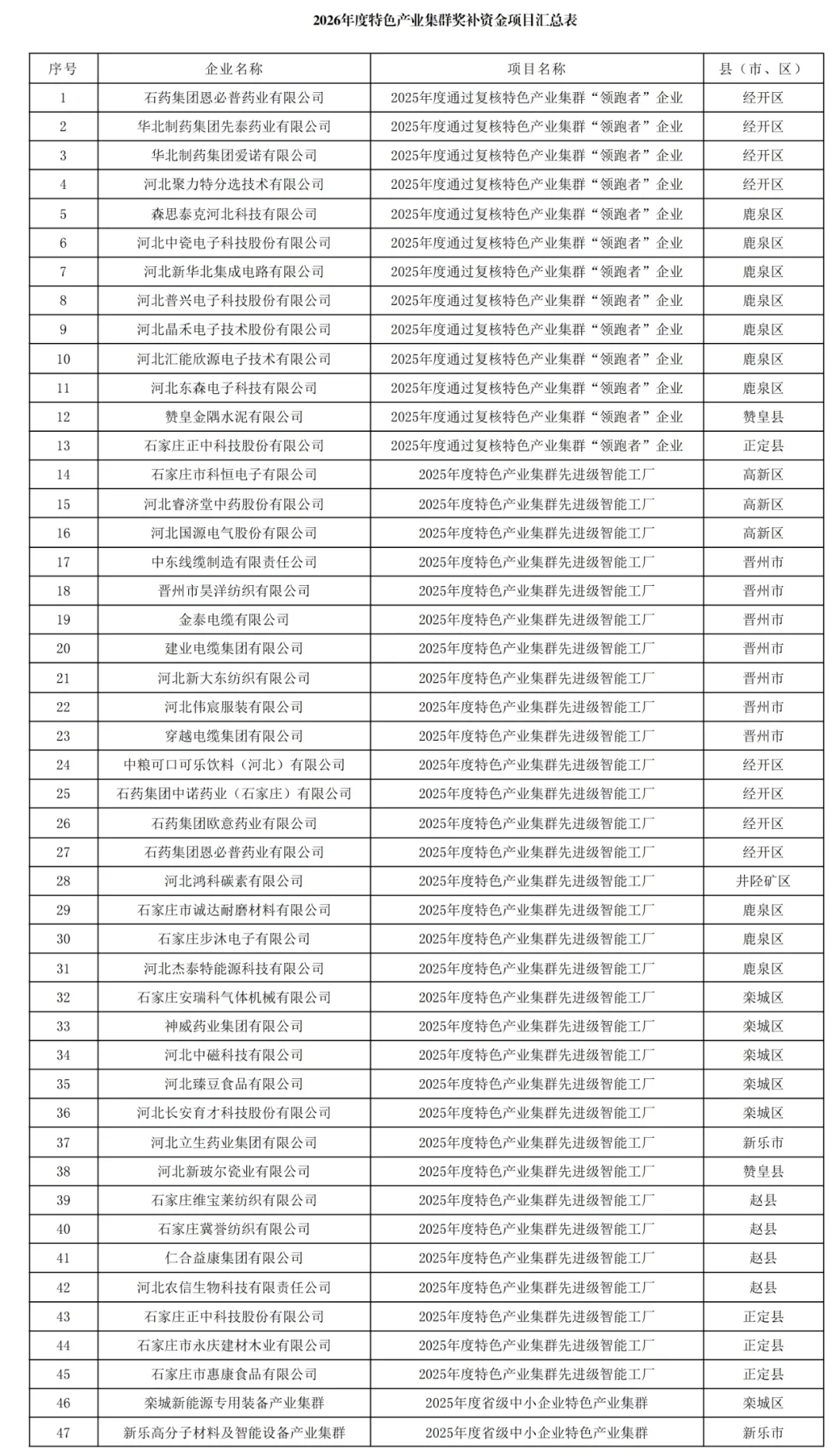 根据2025年7月22日市政府办印发的《石家庄市特色产业集群提档升级三年行动方案(2025—2027年)》相关工作要求,现将2026年度特色产业集群奖补资金拟支持项目企业予以公示。请社会各界监督,如有意见请于公示期内以实名和书面形式反馈。公示时间:2026年4月8日—2026年4月14日