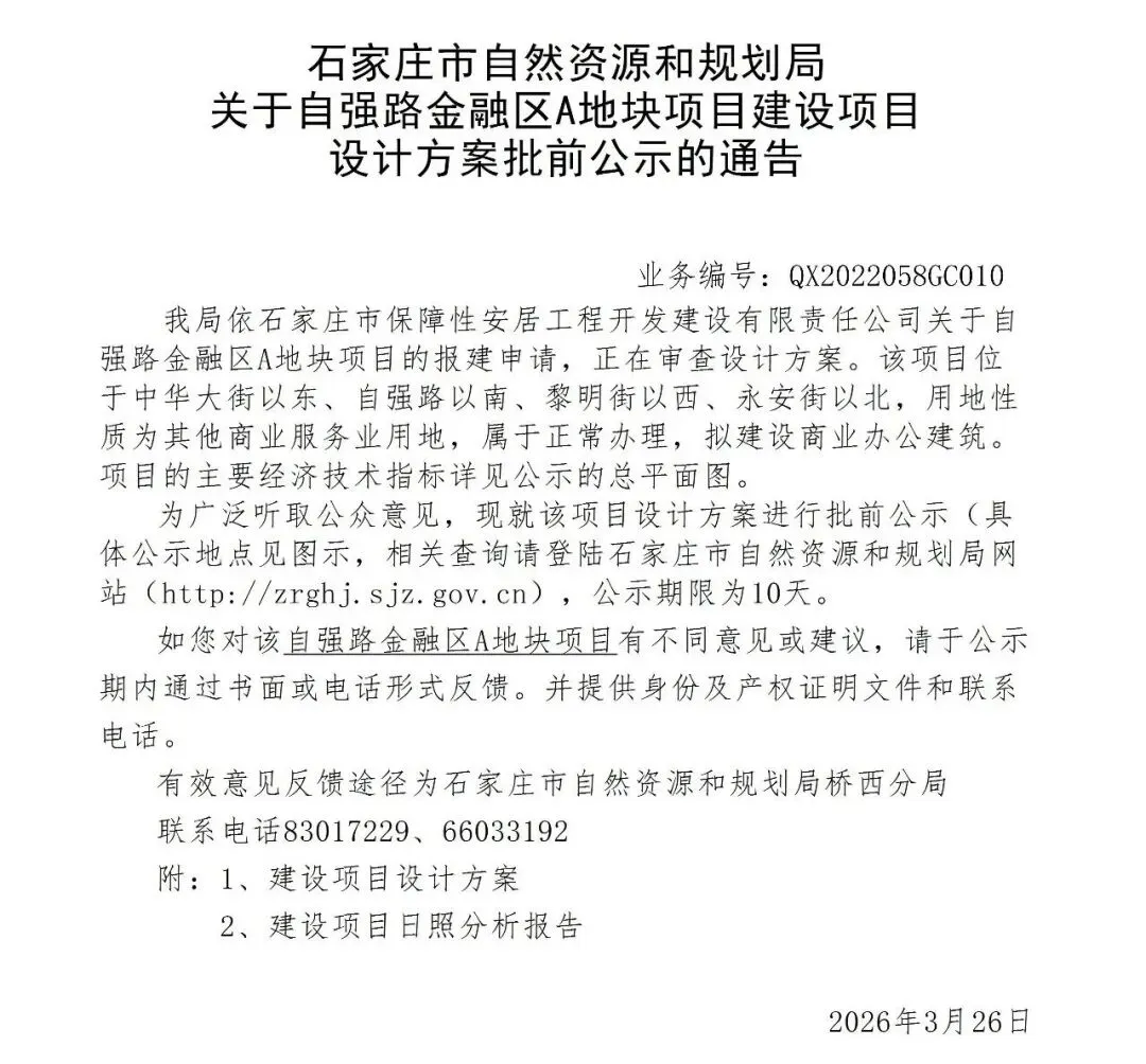 近日,石家庄市自然资源和规划局发布《关于自强路金融区A地块项目建设项目设计方案批前公示的通告》。这意味着,石家庄核心商圈再添重磅商业办公项目,该项目北侧为石家庄万象城,未来是否会是万象城二期?亦或将引进哪个商业品牌?这些疑问均为市场关注的焦点。