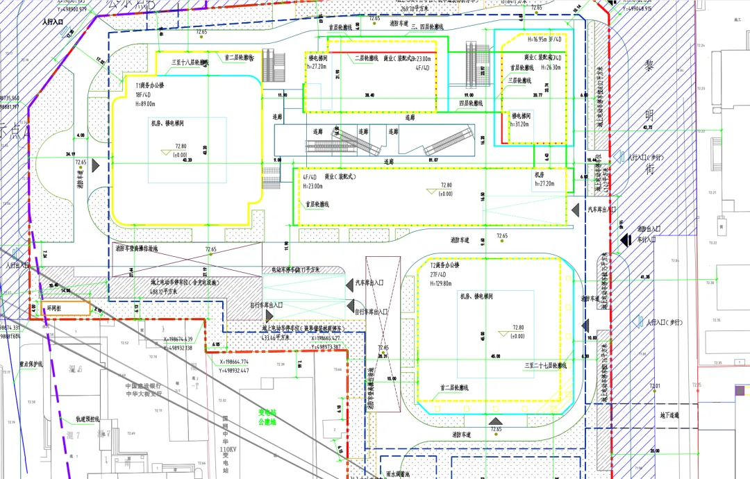 从建筑规划来看,该项目规划2栋商务办公楼,T1楼为18层,建筑高度89.00米;T2楼为27层,建筑高度129.80米;3栋商业楼,中间以连廊衔接,整体将打造集办公、商业于一体的城市综合体项目。