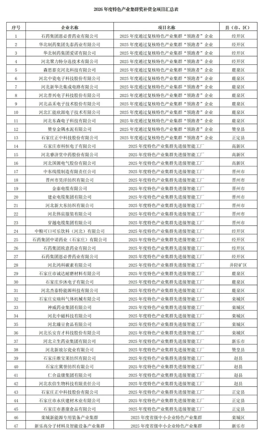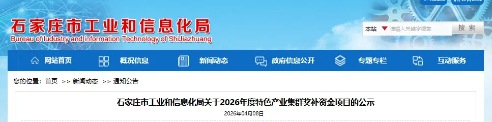 【项目公示】石家庄市工业和信息化局关于2026年度特色产业集群奖补资金项目的公示