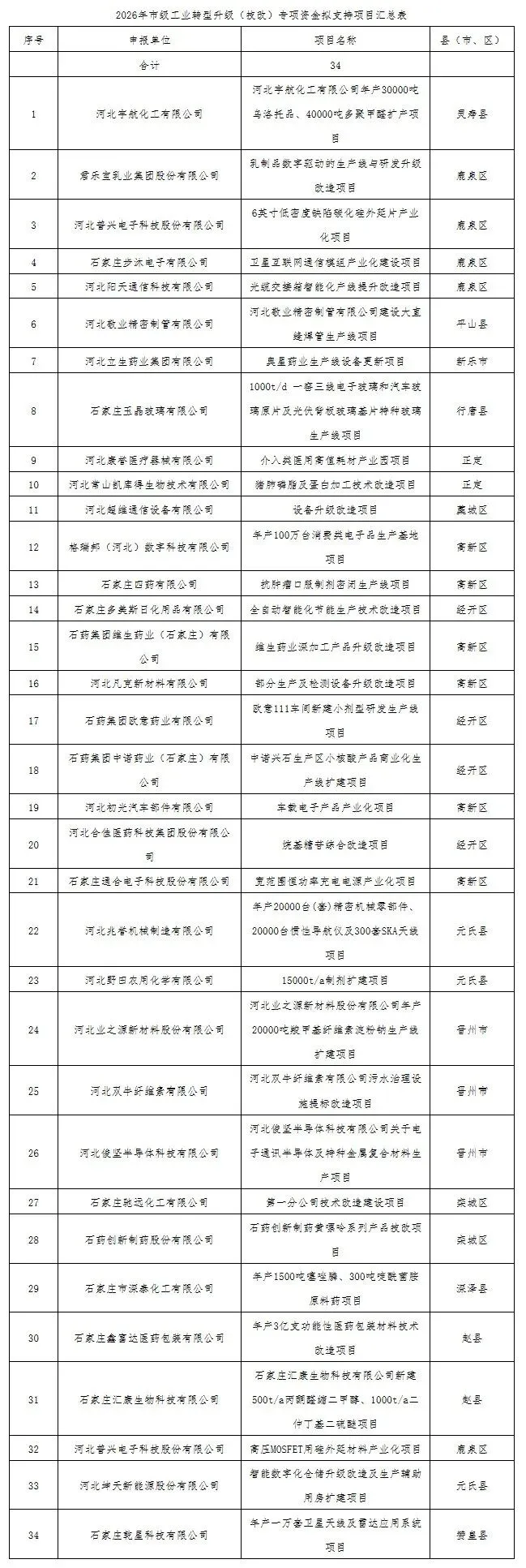 2026年市级工业转型升级(技改)专项资金拟支持项目汇总表