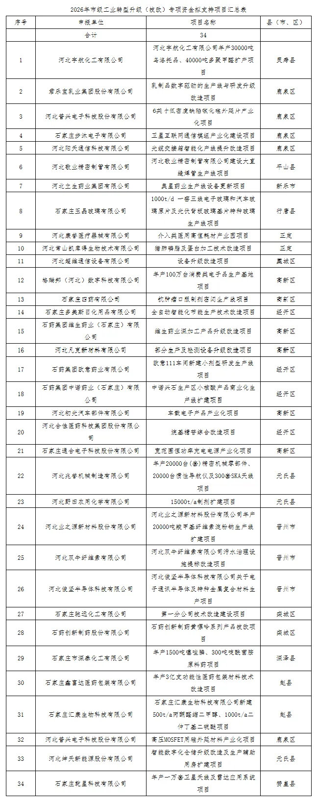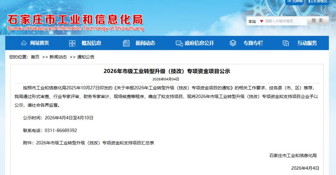 石家庄市工信局 2026年市级工业转型升级(技改)专项资金项目公示
