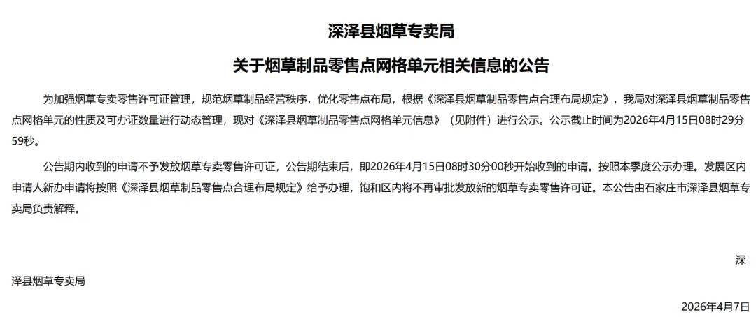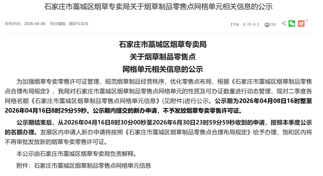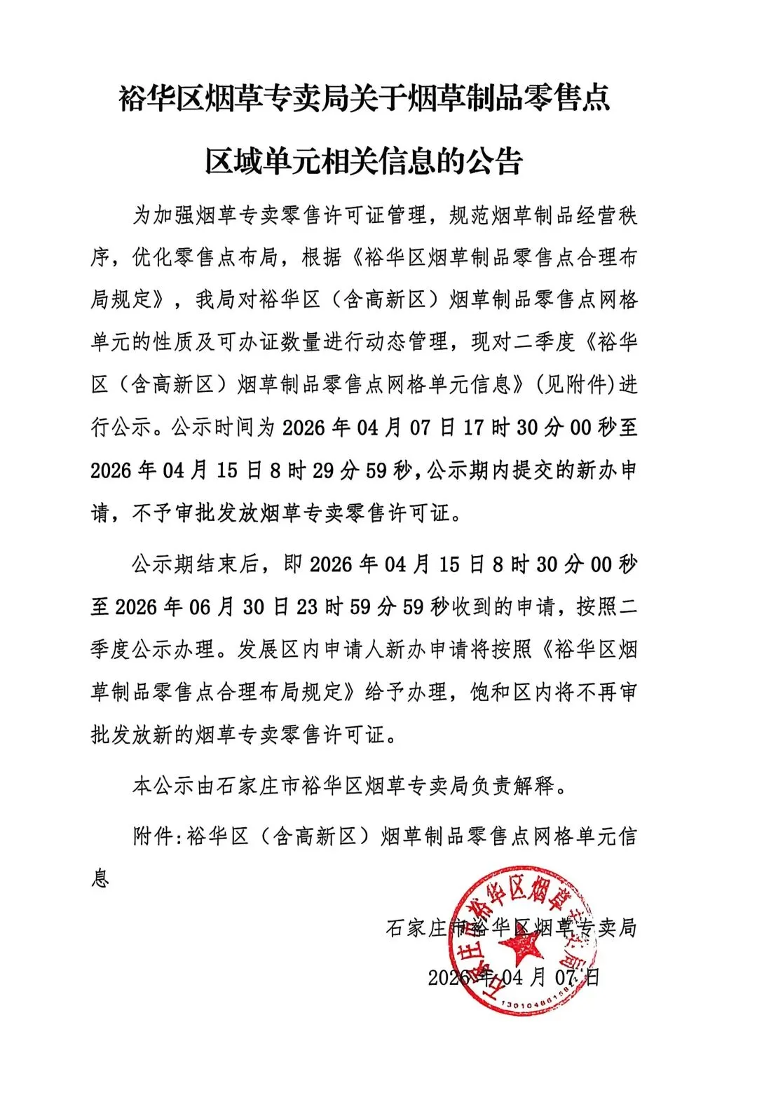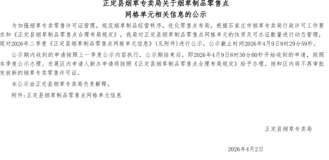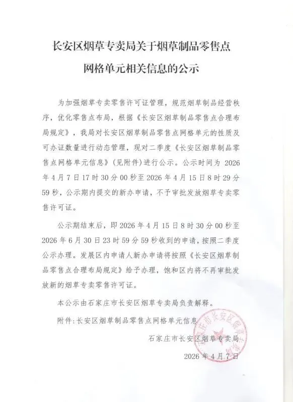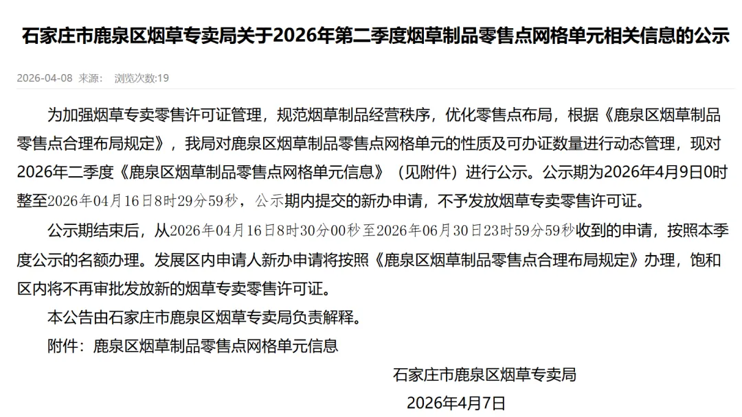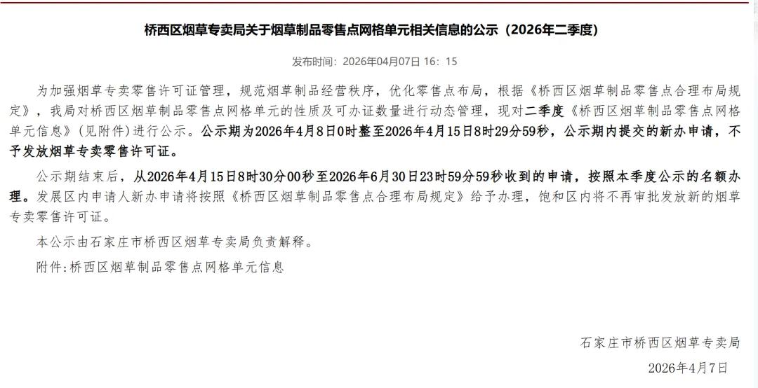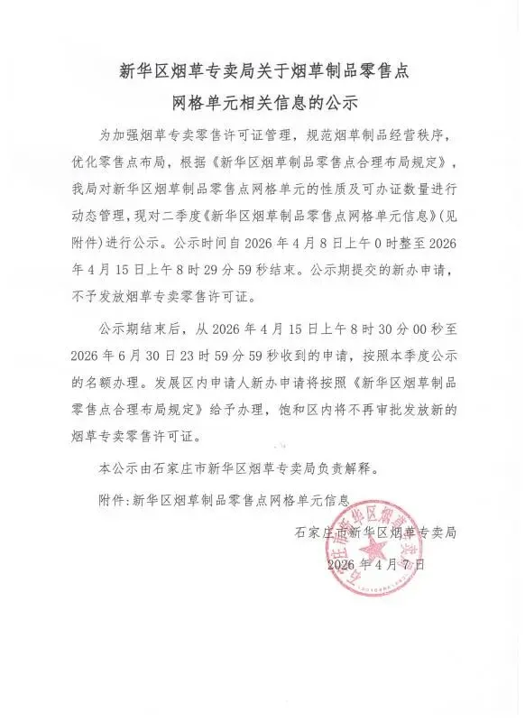 公示期结束后,从2026年04月16日8时30分00秒至2026年06月30日23时59分59秒收到的申请,按照本季度公示的名额办理。发展区内申请人新办申请将按照《鹿泉区烟草制品零售点合理布局规定》办理,饱和区内将不再审批发放新的烟草专卖零售许可证。