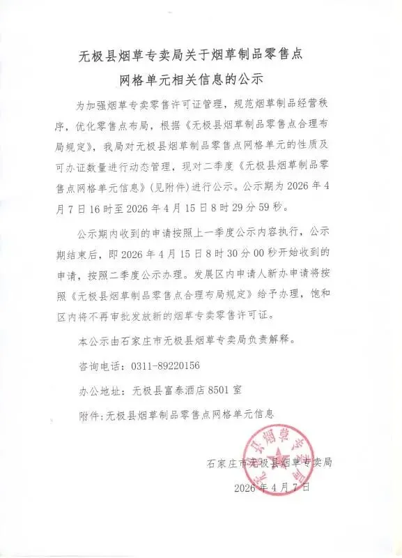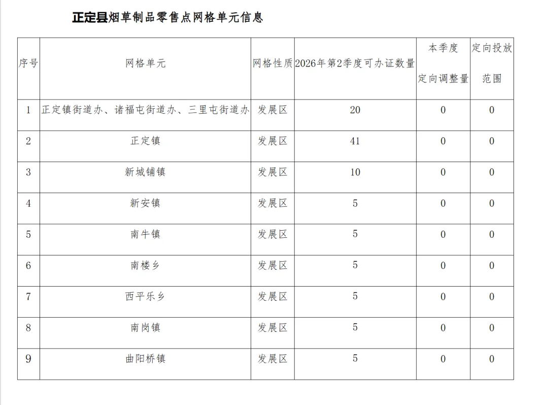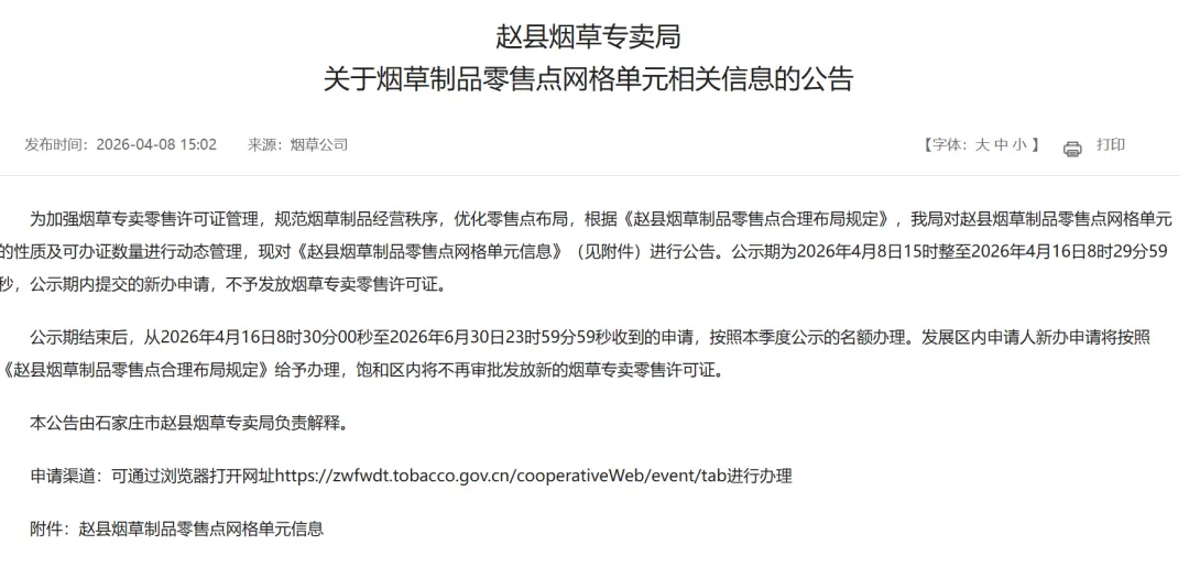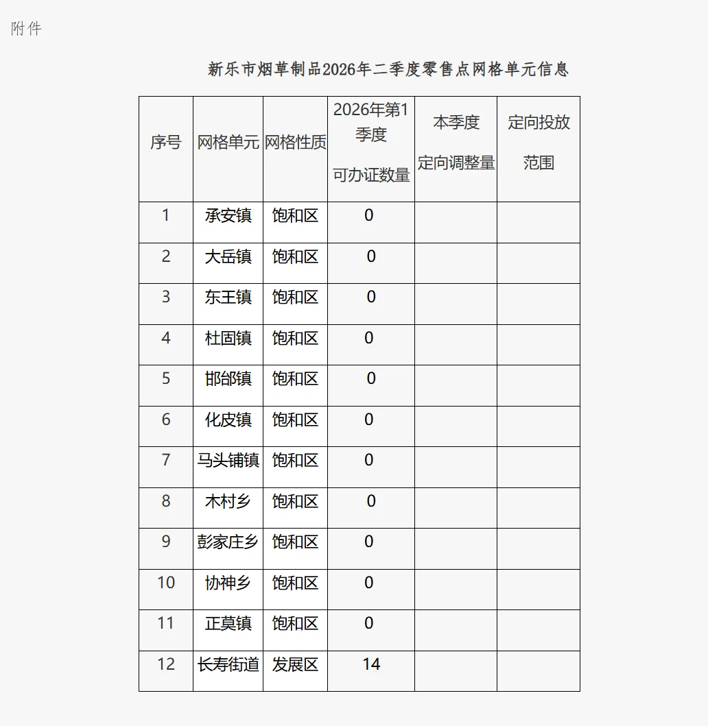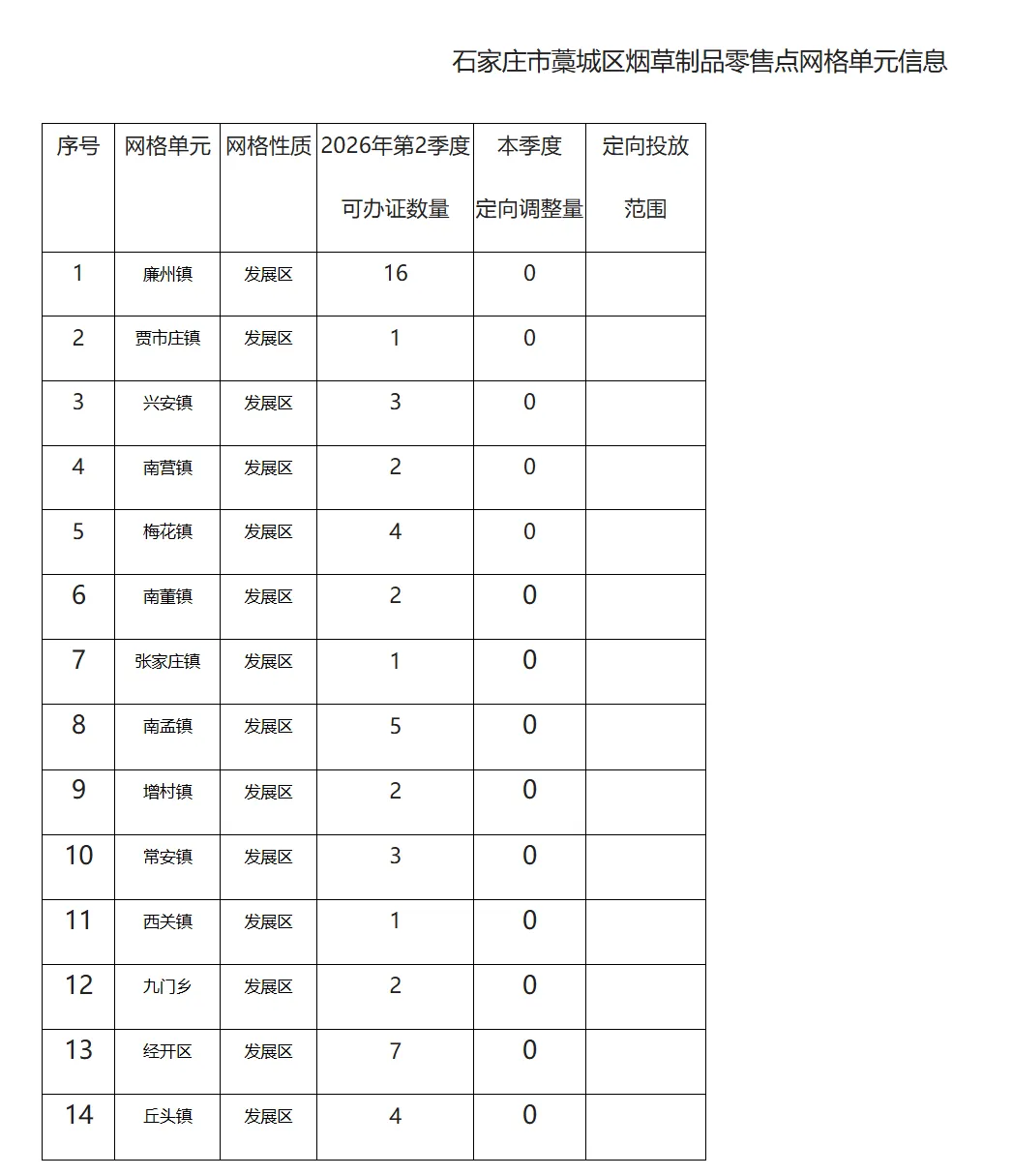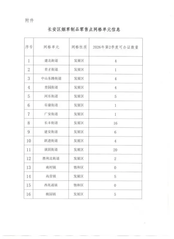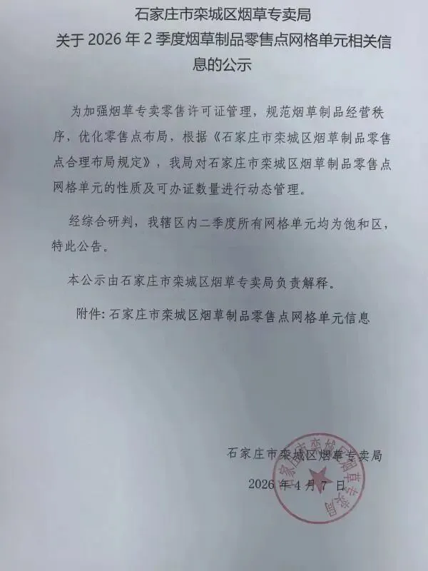 公示期结束后,从2026年04月16日8时30分00秒至2026年06月30日23时59分59秒收到的申请,按照本季度公示的名额办理。发展区内申请人新办申请将按照《鹿泉区烟草制品零售点合理布局规定》办理,饱和区内将不再审批发放新的烟草专卖零售许可证。