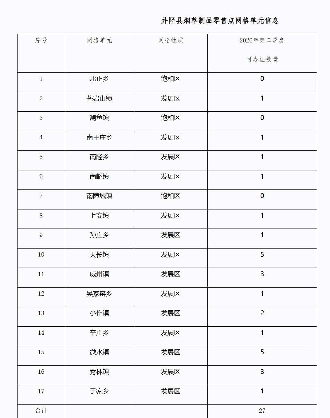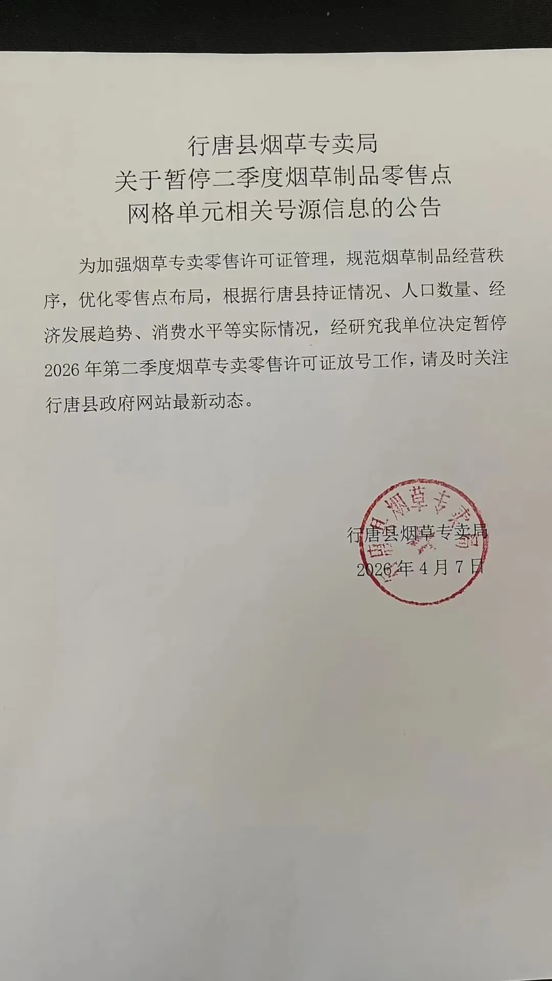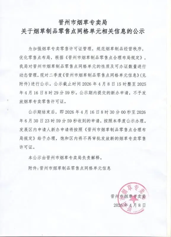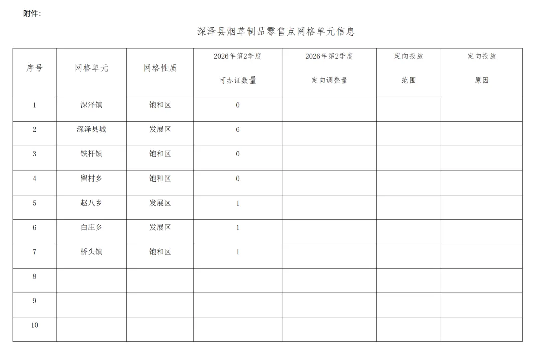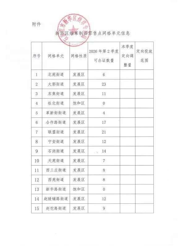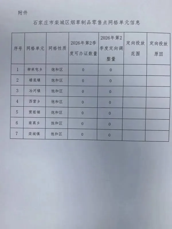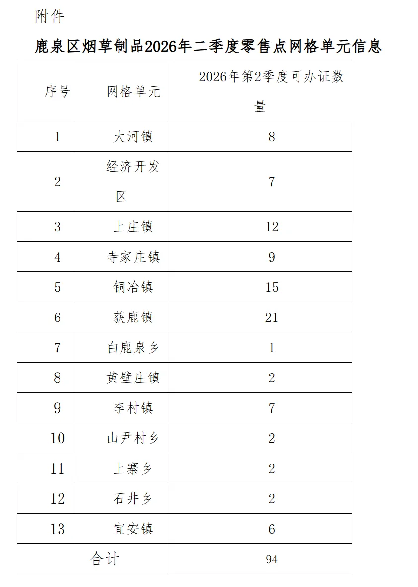 公示期结束后,从2026年04月16日8时30分00秒至2026年06月30日23时59分59秒收到的申请,按照本季度公示的名额办理。发展区内申请人新办申请将按照《鹿泉区烟草制品零售点合理布局规定》办理,饱和区内将不再审批发放新的烟草专卖零售许可证。