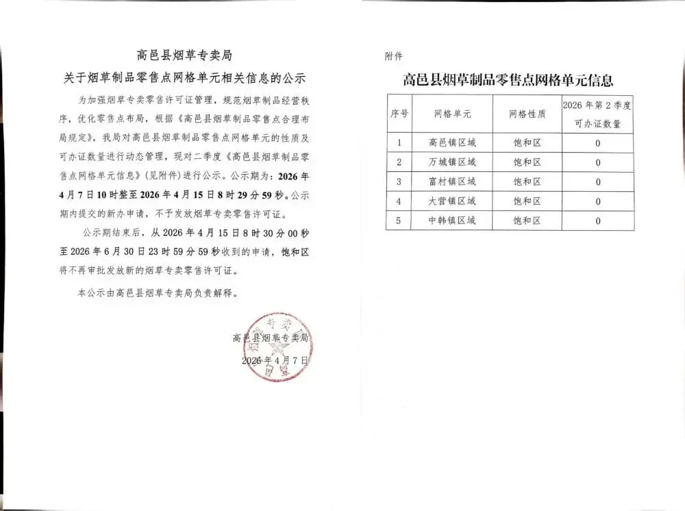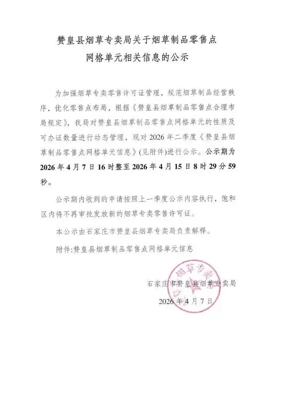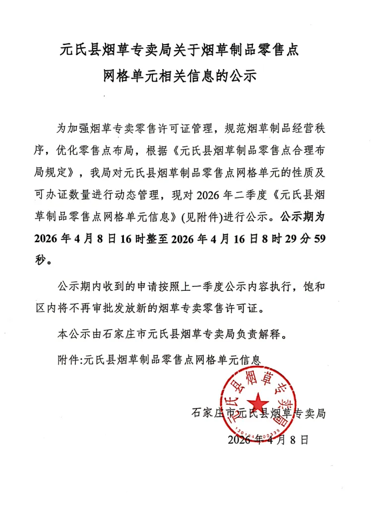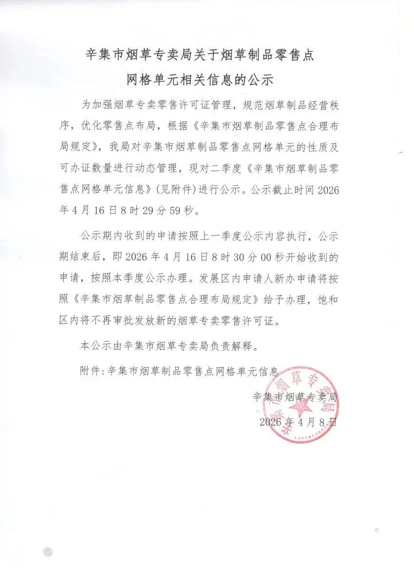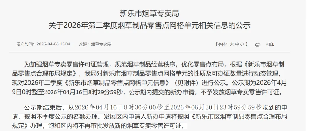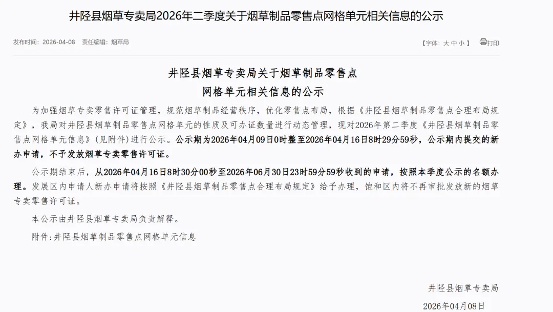 公示期为2026年4月9日0时整至2026年04月16日8时29分59秒,公示期内提交的新办申请,不予发放烟草专卖零售许可证。