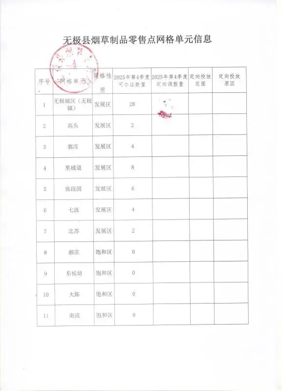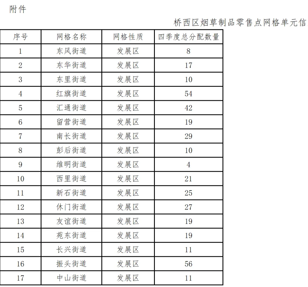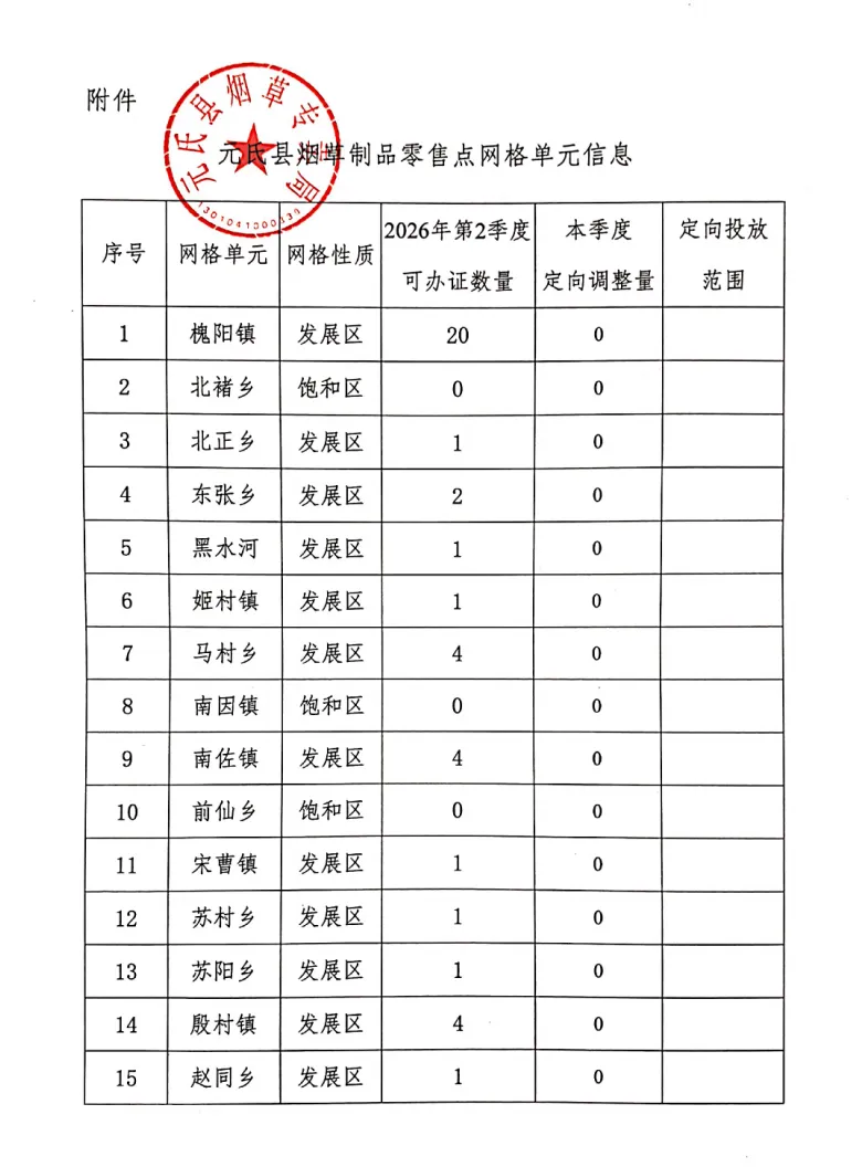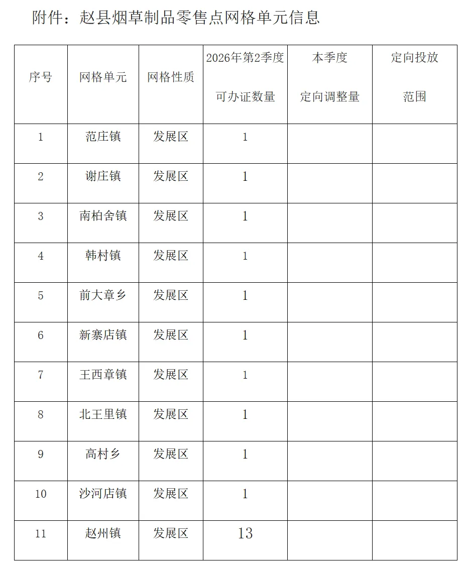 说明:1.根据《赵县烟草专卖局烟草制品零售点合理布局规划》规定,现在赵县人民政府信息公开平台和赵县烟草专卖局行政服务大厅对《赵县烟草制品零售点网格单元信息》进行公示,公示期为7天,有效期为一个季度,公示期结束后按照公示中的时间开始接受申请。