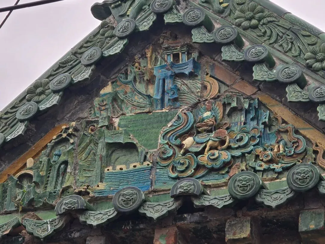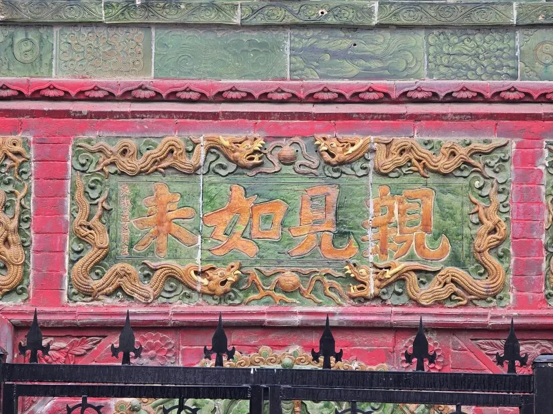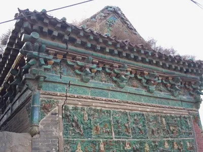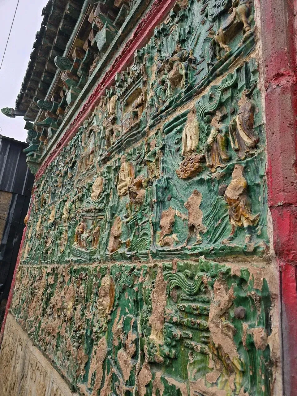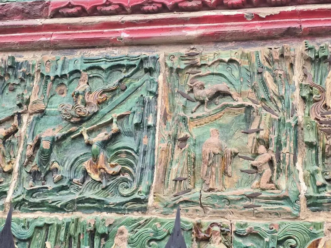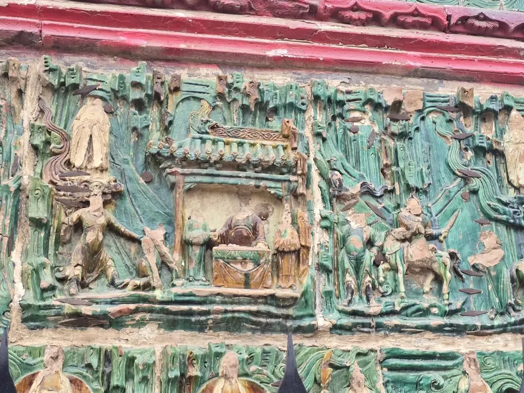 东山墙保存着一组完整的琉璃浮雕群,讲述 "观音救难" 的佛传故事。人物、楼阁、祥云、花鸟栩栩如生,绿、黄、蓝、白釉色斑斓,阳光一照,流光溢彩,仿佛一幅立体的琉璃画卷。