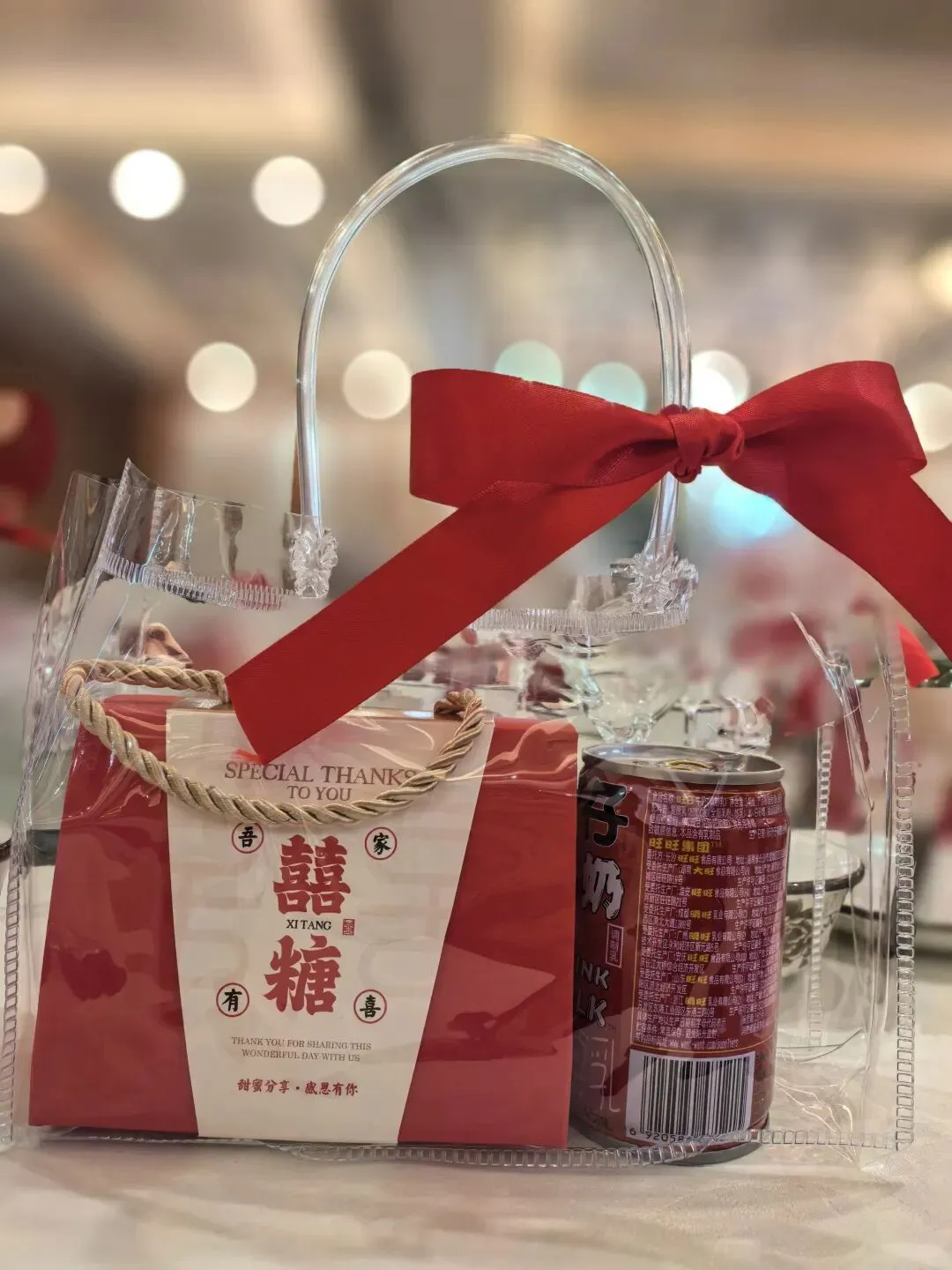 为每一位宾客准备的伴手礼,是新人心意的温柔传递:透明手提袋系上热烈的红蝴蝶结,「吾家有囍」的喜糖盒满载甜蜜,搭配寓意圆满的饮品,每一份都藏着对宾客的感恩与祝福,让这份喜悦从入座的第一刻就开始蔓延。