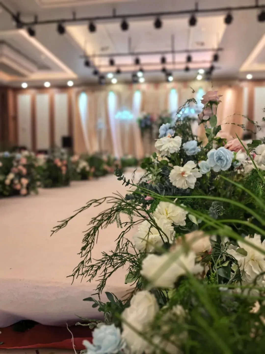 以浅粉、柔蓝、奶白为主调的花艺,沿着婚礼T台层层铺展,蓬松的花簇搭配灵动的叶材,将温柔与浪漫拉满。暖调的灯光透过纱幔洒下,为整个空间镀上一层温柔的光晕,新人携手走过的每一步,都被鲜花与爱意环绕。