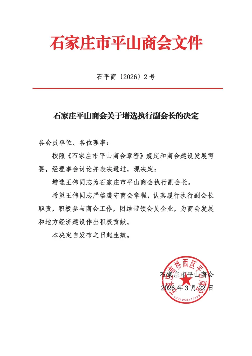 • 增选王伟同志为石家庄市桥西区平山商会执行副会长。