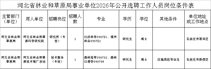 四、选聘范围具备扎实专业知识、丰富科研经历的相关专业优秀博士研究生,并且获得博士学位。五、选聘程序(一)发布信息在河北人社网(https://rst.hebei.gov.cn/)、河北省林业和草原局网站(http://lycy.hebei.gov.cn/)面向社会公开发布选聘信息。(二)报名及资格审查通过电子邮箱方式接收报名,每名应聘人员只能申报一个岗位,并准确填写《河北省林业和草原局事业单位2026年公开选聘工作人员报名表》(附件2)。报名时间:2026年4月9日—5月9日报名邮箱如下:省林业和草原科学研究院:hbslkyrsk@163.com;省林业和草原技术推广总站:hblctgz@163.com。报名邮件主题格式为“姓名+报考单位+岗位名称+联系电话”。邮件附件中应有下列内容的扫描件:身份证、本科、硕士、博士毕业证和学位证(2026年应届高校毕业生报名时未取得双证的,上传学信网相关证明)、成绩单、《河北省林业和草原局事业单位2026年公开选聘工作人员报名表》、证明本人学习工作经历与业绩的其他材料,上述附件须确保清晰并以压缩包形式发送。工作人员收到报名信息后,初步审核电子申报材料,将会回复邮件,告知报名是否成功以及需要补充的材料。请报考人员务必注意查收回复信息。只有收到“姓名+你已报名成功。”信息后,才属于报名成功。根据岗位条件要求,对报名人员信息进行资格审查。报考人员应保证所提供的各种材料和信息真实、准确,凡本人填写信息不真实、不完整或填写错误的,责任自负。对报考资格的审查贯穿招聘全过程。在各环节发现报考者不符合报考资格条件的,取消其选聘资格。凡弄虚作假者,一经发现,取消选聘资格。
