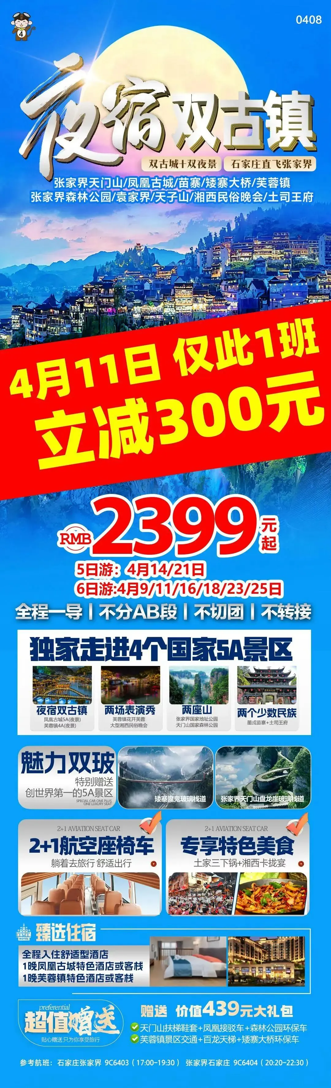 ✈【夜宿双古镇】石家庄张家界双飞5/6日游