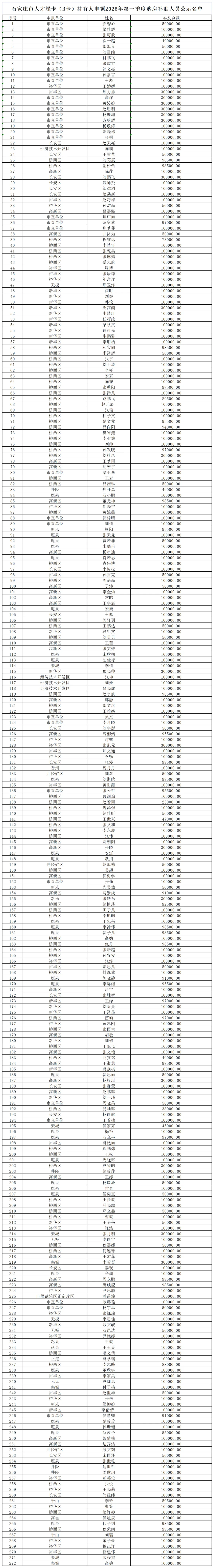 附件:石家庄市人才绿卡(B卡)持有人申领2026年第一季度购房补贴人员公示名单 来源:石家庄人社局