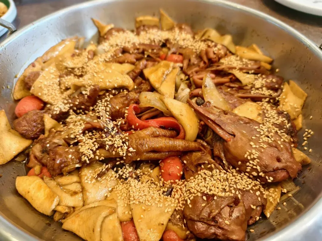 他家的鸭头(小锅68元)是先卤后炒的,处理得特别干净,毫无腥味。鸭头上的肉软烂入味,轻轻一吸骨头和肉就能完美分离。最绝的是那些资深食客发明的隐藏吃法:等吃完鸭头后,让老板加汤涮菜,最后一定要加一份8元的抻面。面条在那种充满了鸭肉香和麻辣味的浓郁汤汁里煮熟,爽滑劲道,再配上一瓶5元的冰镇北冰洋,辣得你直呼“嘶哈”却又根本停不下筷子。