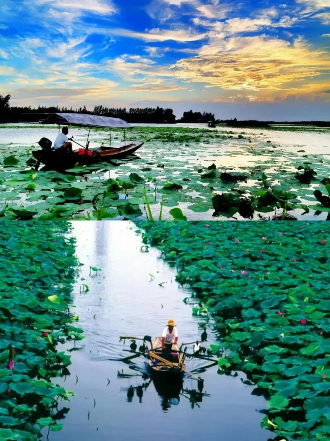 143个淀泊相连,万亩芦苇荡随风起伏,盛夏千亩荷塘粉白相间,荷风送香;晨雾里渔舟唱晚,水鸟翩跹。