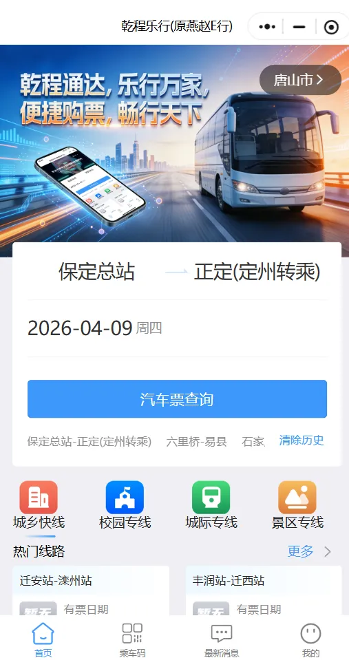 线上购票可通过乾程乐行微信小程序等线上平台购票,起始站选择【保定】--【保定客运总站】,到达站输入正定(定州转乘),查询后即可购票。