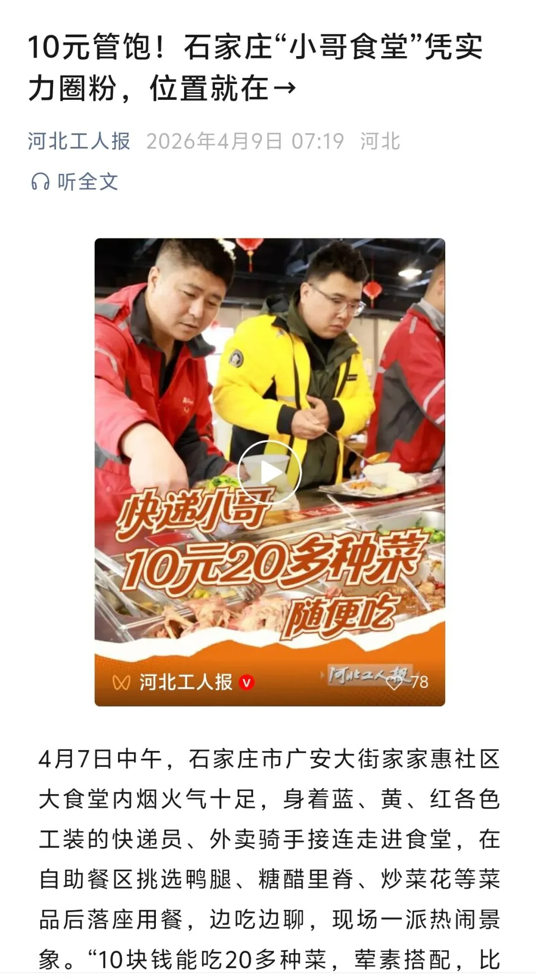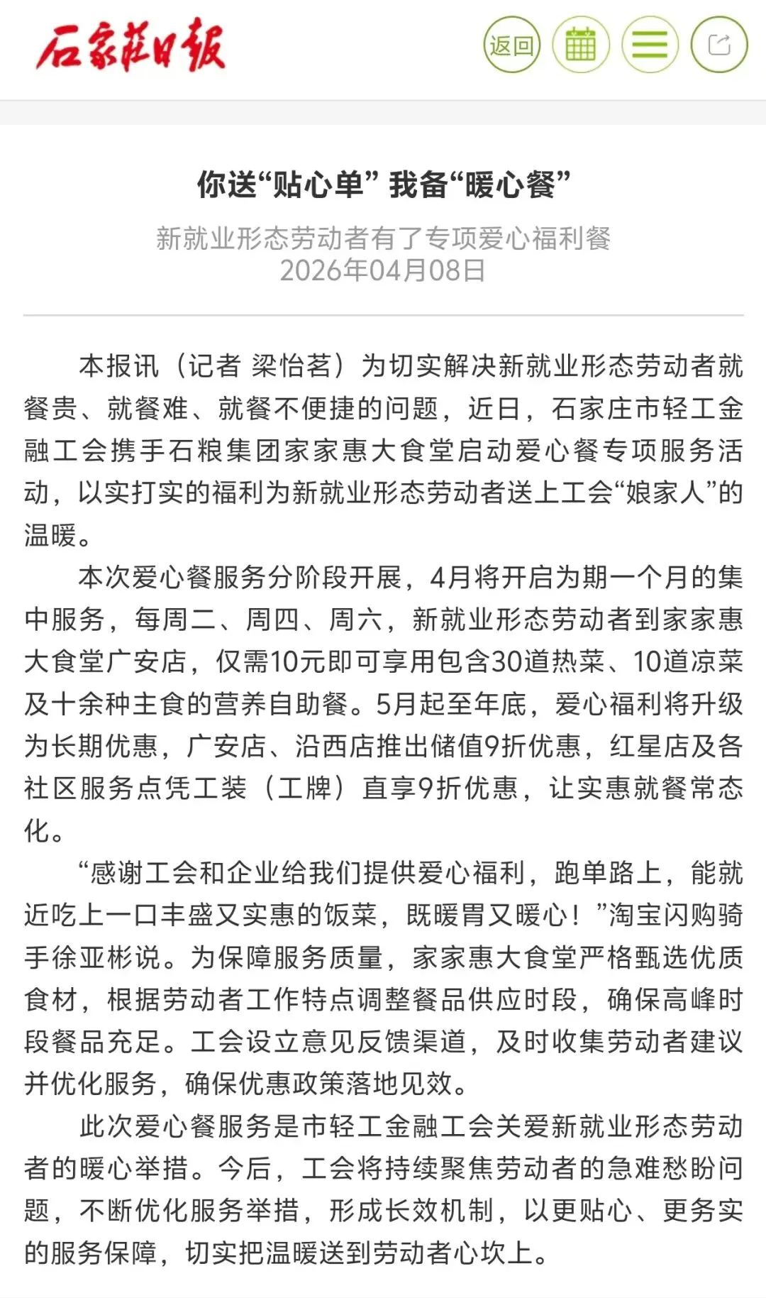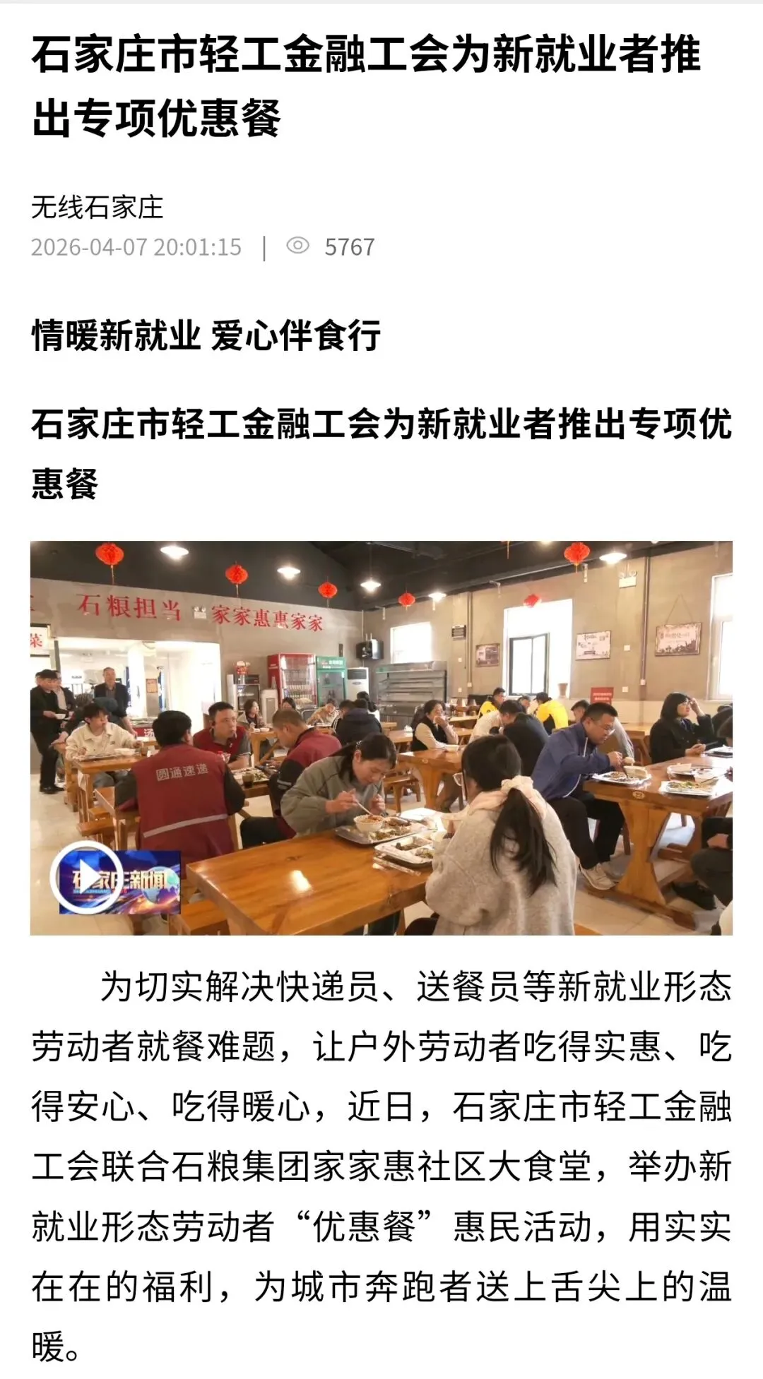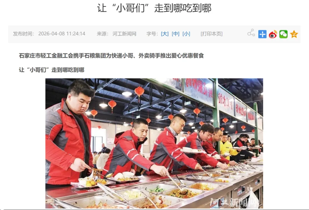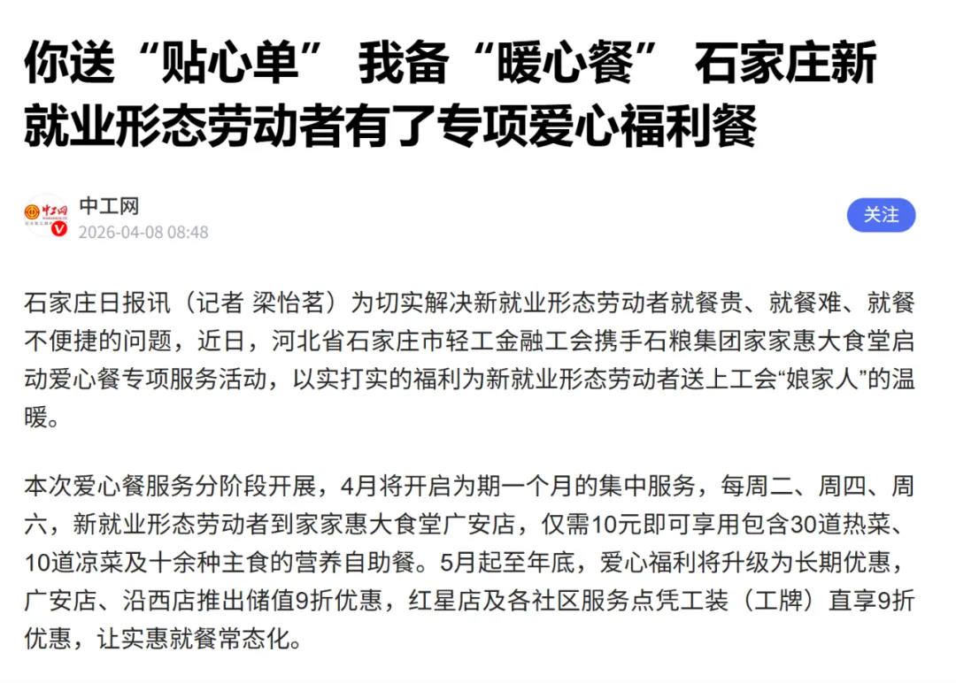 为切实解决新就业形态劳动者就餐贵、就餐难、就餐不便捷的问题,近日,河北省石家庄市轻工金融工会携手国投集团所属石粮家家惠社区大食堂启动爱心餐专项服务活动,以实打实的福利为新就业形态劳动者送上工会“娘家人”的温暖。这一暖心惠民举措得到了河北工人报、河工新闻网、中工网、石家庄新闻、石家庄日报、石家庄新闻广播、无线石家庄等多家权威媒体的报道和发布,引起了多方关注。