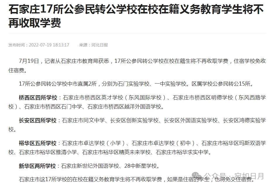 这里面“消失”的时间主要集中在2022年7月,官方发布:17所“公参民”转公,学校在校在籍义务教育学生将不再收取学费,住宿学校免收住宿费。其中,市属学校2所:石门实验学校、一中实验学校,区属学校15所,他们可是当年择校的热门。当然,还有一些纯民办学校由于各种情况,退出了历史舞台。