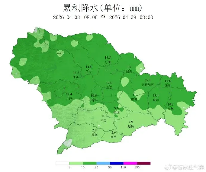 4月8日白天到夜间我市出现降雨,全市平均降雨量11.0毫米。无极的城区最大为19.1毫米。长安区、桥西区、新华区、裕华区降雨量7.9至15.7毫米,平均降雨量12.4毫米,南高基公园最大。