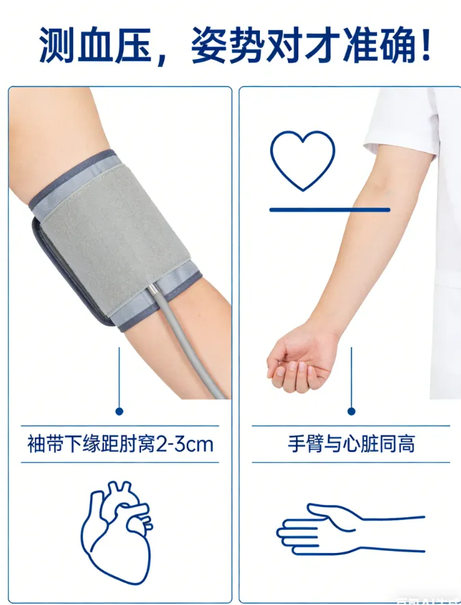 - ✅正确姿势:坐在椅子上,后背紧贴椅背,双脚平放地面,手臂放在桌子上,与心脏同高,手掌向上,放松肌肉