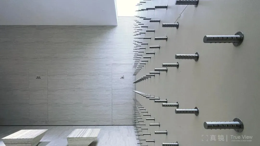 这个空间也是本项目独有的,后来在其他的项目中再也没有见到过。墙面铺满均匀布置的小金属棒,金属棒上有圆点。经介绍是灯光装置的艺术空间,前方放置9个整石座凳,对景墙上方开天窗,用漫射光提升此空间的神性效果。