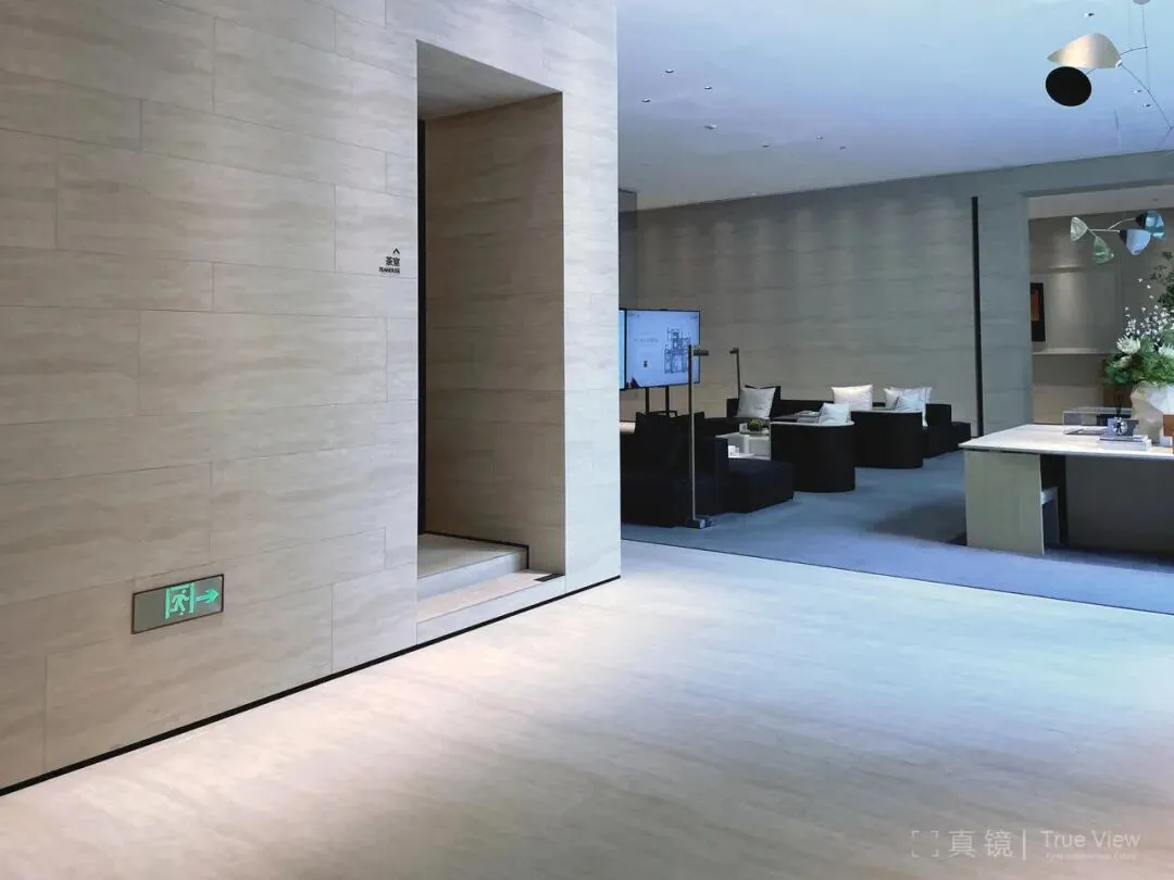 峯叁号院的建筑处理相当克制,包括首层的园区大堂的室内,都是浅色石灰石组成的体块组合,只有金色大门做色彩的平衡。