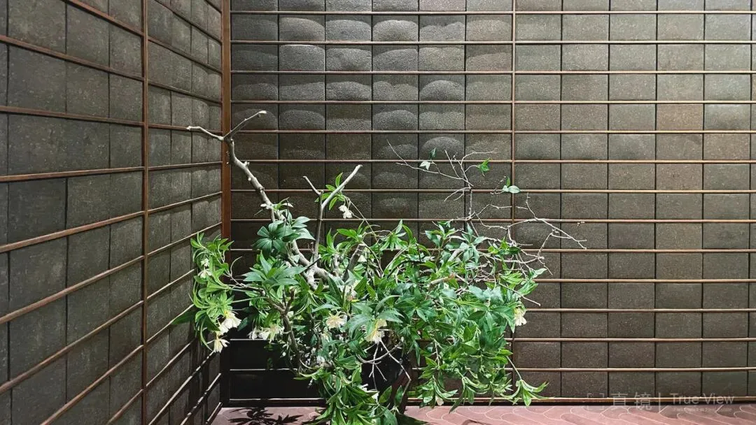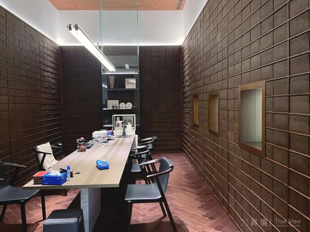 在保持统一气质的石灰石盒子中,其他功能的布置通过室内设计也形成特殊的空间。茶室盒子是需要向上走几步台阶的。内部全然变样,为茶砖质感组成的墙面装饰,按模数留出3个洞口,可以看到外面的镜面盒子。