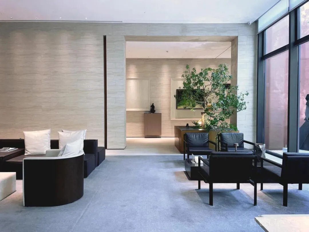 峯叁号院的建筑处理相当克制,包括首层的园区大堂的室内,都是浅色石灰石组成的体块组合,只有金色大门做色彩的平衡。