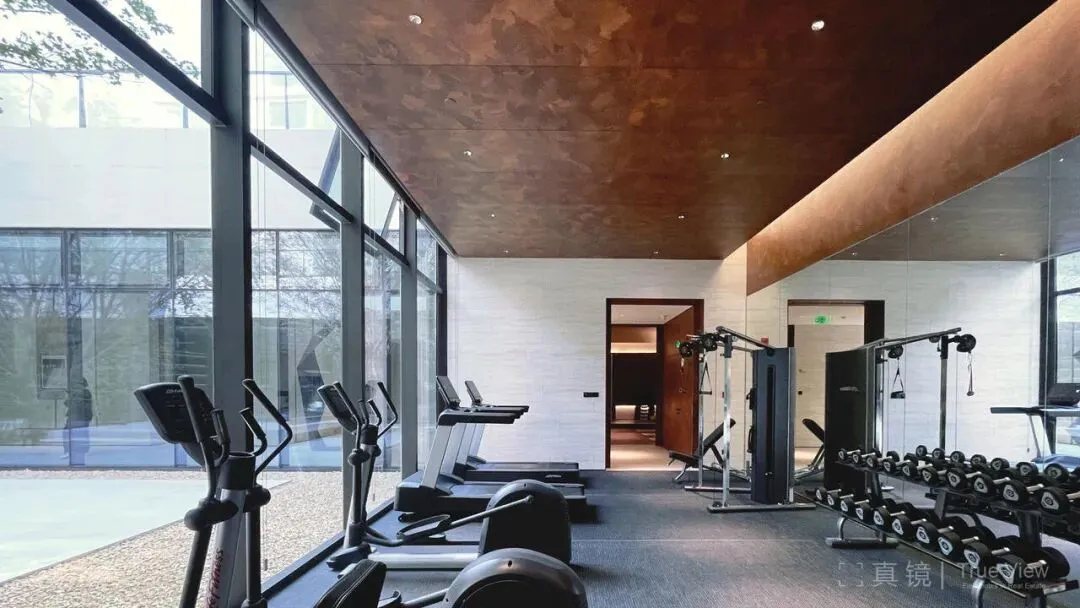 首先是拼花木板的应用,在各个功能空间里,都在不同部位使用这个材料。在瑜伽房,木板在墙面中间部位,上下布置隐藏式泛光;健身房,木板贴在屋顶天花处,镜子上方也是;在棋牌室与小会议室,木板用在入口部位,柜子与墙面都用其进行包裹。