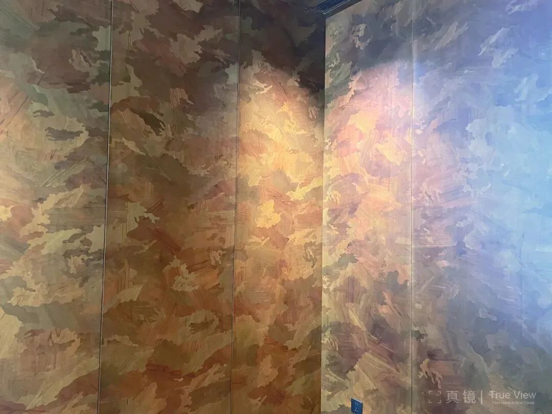 另一个红色是金属板,尤其在公区。金属板和首层大堂的金色大门不是一个色系,地下会所的金属板都是偏红色的,对应下方都设置地面泛光。金属板连续布置,形成明显的通道感。