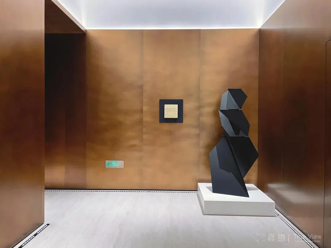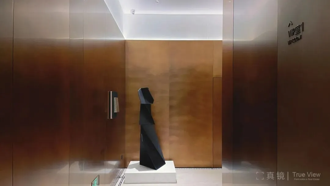 峯叁号院的建筑处理相当克制,包括首层的园区大堂的室内,都是浅色石灰石组成的体块组合,只有金色大门做色彩的平衡。
