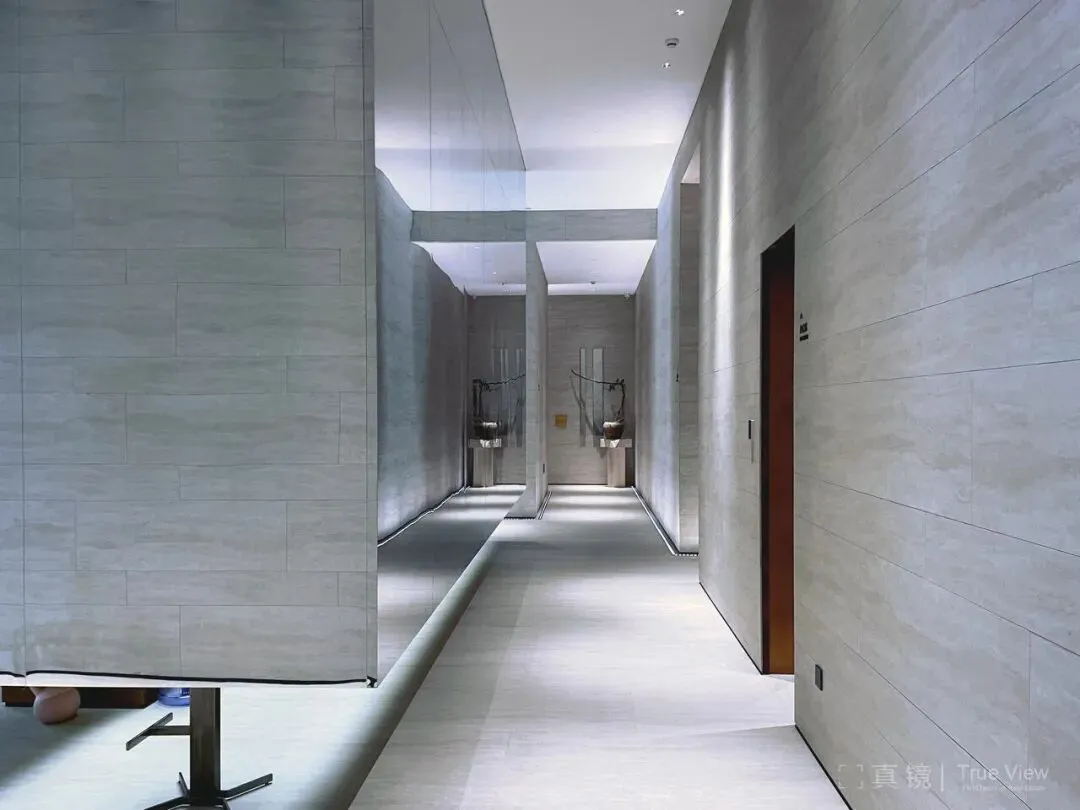 在保持统一气质的石灰石盒子中,其他功能的布置通过室内设计也形成特殊的空间。茶室盒子是需要向上走几步台阶的。内部全然变样,为茶砖质感组成的墙面装饰,按模数留出3个洞口,可以看到外面的镜面盒子。