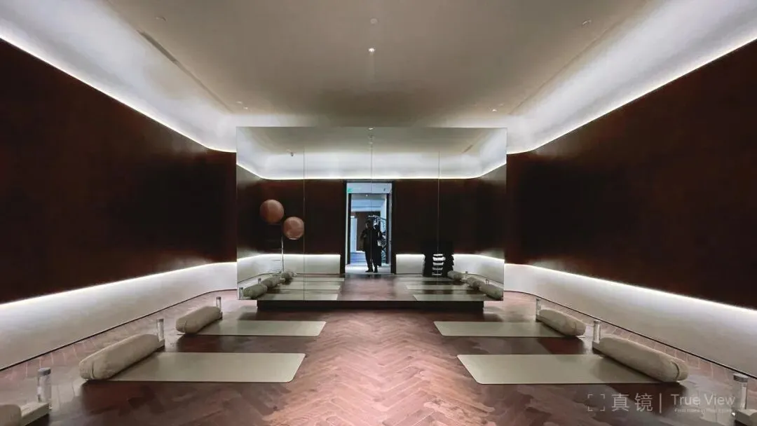 首先是拼花木板的应用,在各个功能空间里,都在不同部位使用这个材料。在瑜伽房,木板在墙面中间部位,上下布置隐藏式泛光;健身房,木板贴在屋顶天花处,镜子上方也是;在棋牌室与小会议室,木板用在入口部位,柜子与墙面都用其进行包裹。
