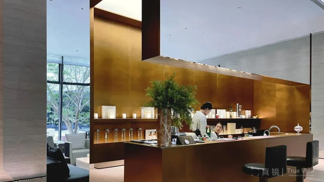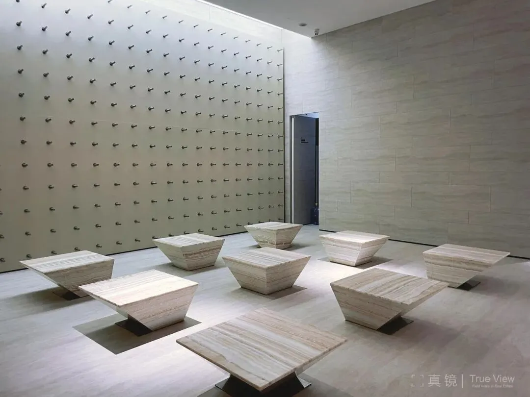 峯叁号院的建筑处理相当克制,包括首层的园区大堂的室内,都是浅色石灰石组成的体块组合,只有金色大门做色彩的平衡。