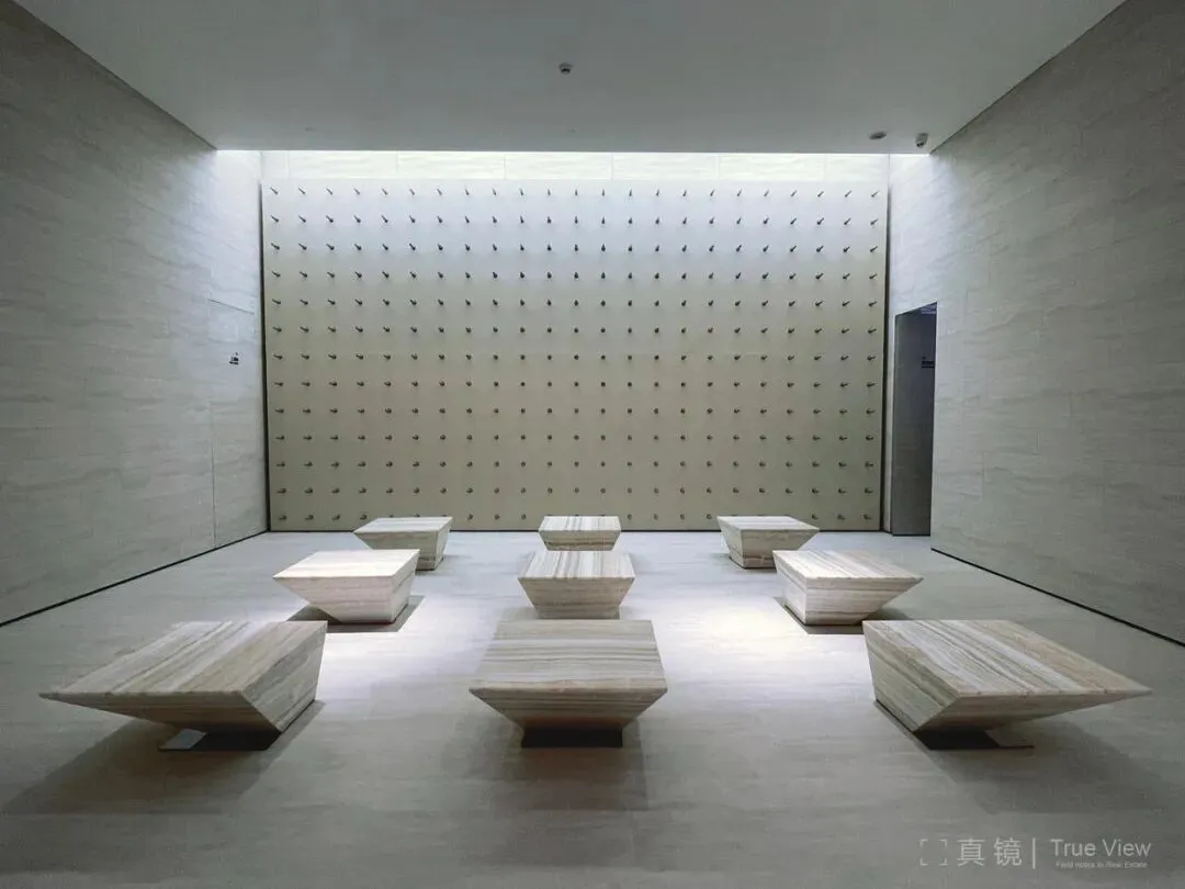 这个空间也是本项目独有的,后来在其他的项目中再也没有见到过。墙面铺满均匀布置的小金属棒,金属棒上有圆点。经介绍是灯光装置的艺术空间,前方放置9个整石座凳,对景墙上方开天窗,用漫射光提升此空间的神性效果。