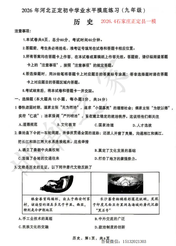 >2026.4石家庄正定县九年级一模历史试卷含答案