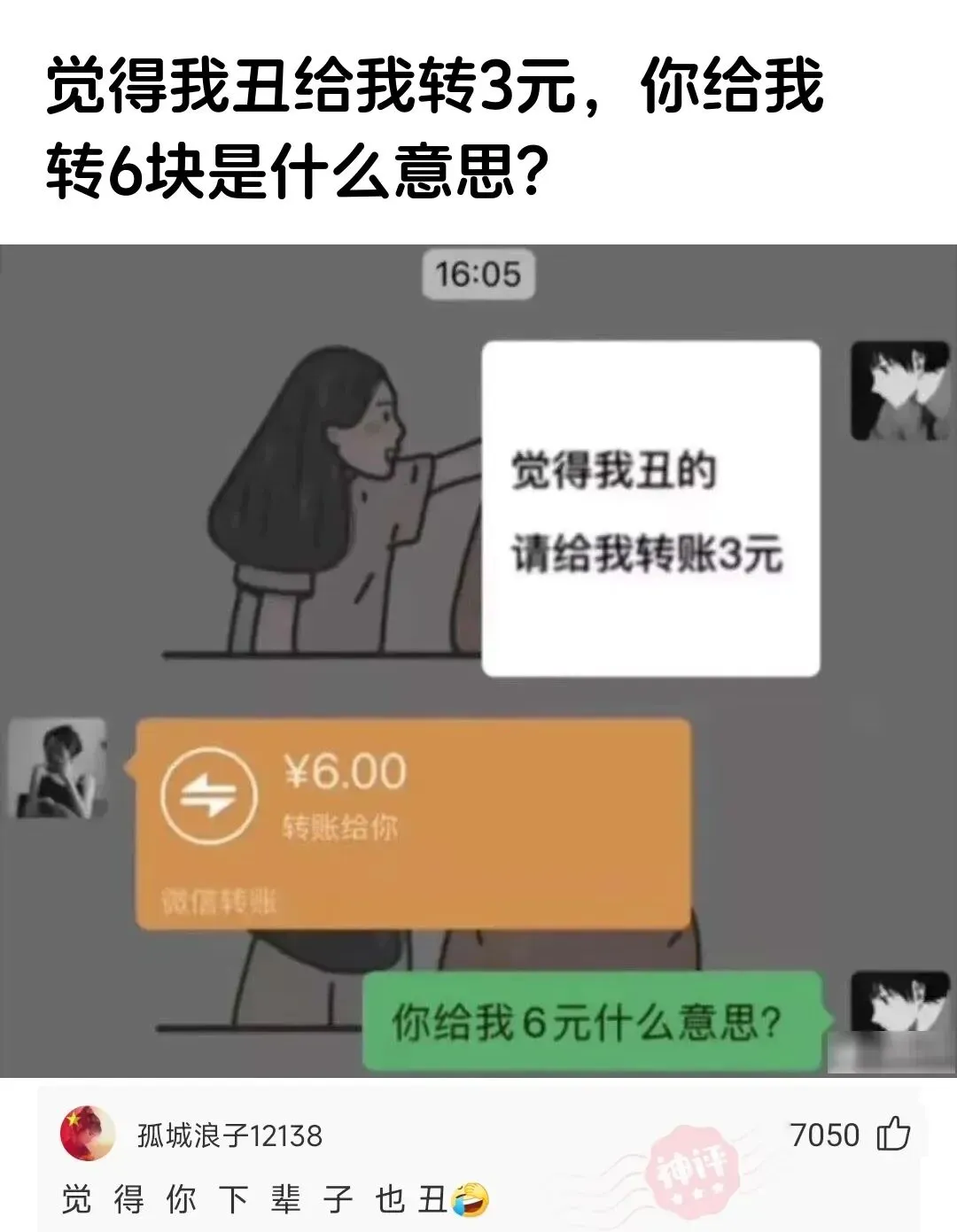 卧槽!让转3块嫌我丑,你转6块是几个意思?!占便宜还想骂我 twice?