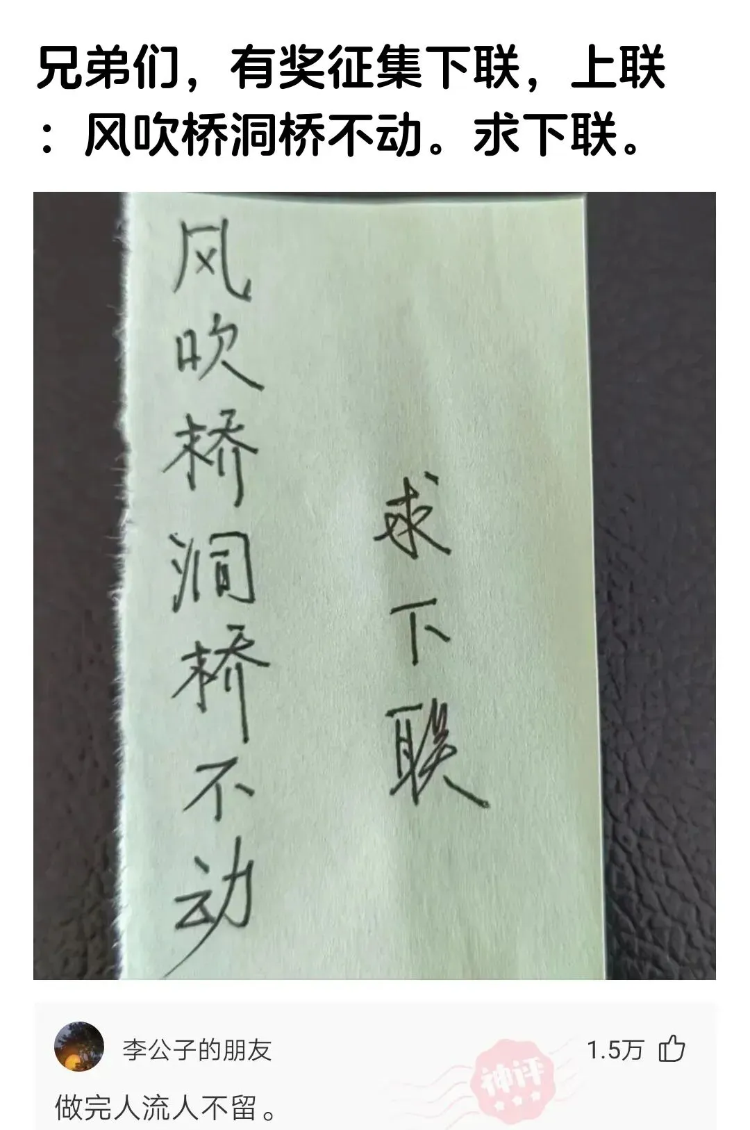 别划走!上联“风吹桥洞桥不动”愁坏网友!下联征集开始,手慢无!